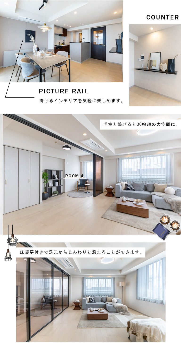 キッチンと合わせて約25.0帖の広々としたリビングダイニング。南東・南西・北東の3面採光で自然光がたっぷり降り注ぎます。リビングスペースとダイニングスペースの空間分けがしやすい間取りが特徴的で、家族はもちろん、ゲストが来た時もゆったり過ごせそうですね。スタイリッシュなビルトインエアコン、掛けるインテリアを気軽に楽しめるピクチャーレール付きなのも嬉しいポイントです。