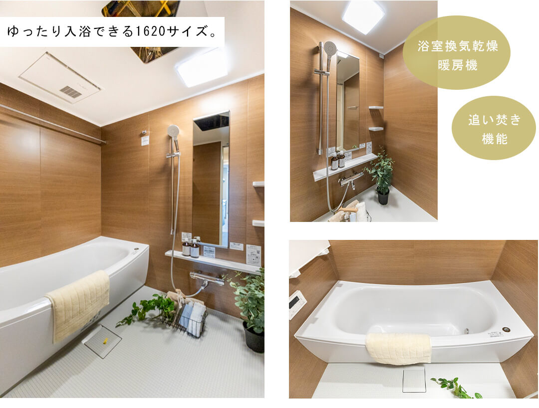 ゆったり入浴できる1620サイズのバスルーム。木目基調の内装で、温かみのある空間です。換気・暖房・乾燥・涼風機能付きで1年中快適なバスタイムに。丸みを帯びた浴槽が疲れた身体を包み込んでくれそうです。追い焚き機能も付いているので、家族の入浴時間がずれてしまった時、半身浴をしたい時に助かります。