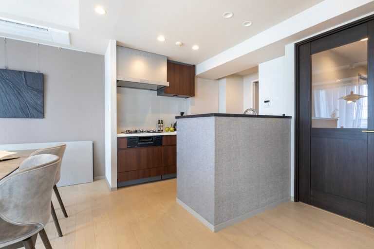 リビングダイニングに接続するキッチンですが、奥にも扉があり、洗面室に接続しています。買い物帰りに手を洗ってすぐ食材を運んだり、料理中に洗濯やお風呂掃除をしたい時にも便利。家事効率が上がりそうですね。