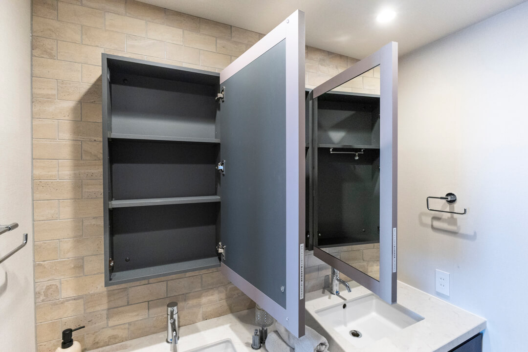 洗面化粧台はゆとりのある2ボウルタイプ。2人並んで使用でき、忙しい朝の身支度もスムーズに行えそうです。ミラーボックスに足元の引き出し、可動棚など、豊富な収納も魅力的です。