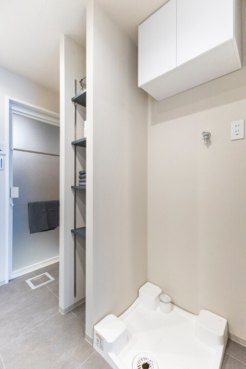 洗面室はキッチンと廊下に接続しています。買い物帰りに手を洗い、食材をキッチンに運んだり、料理中に洗濯やお風呂掃除をしたい時にも便利。家事効率が上がりそうですね。