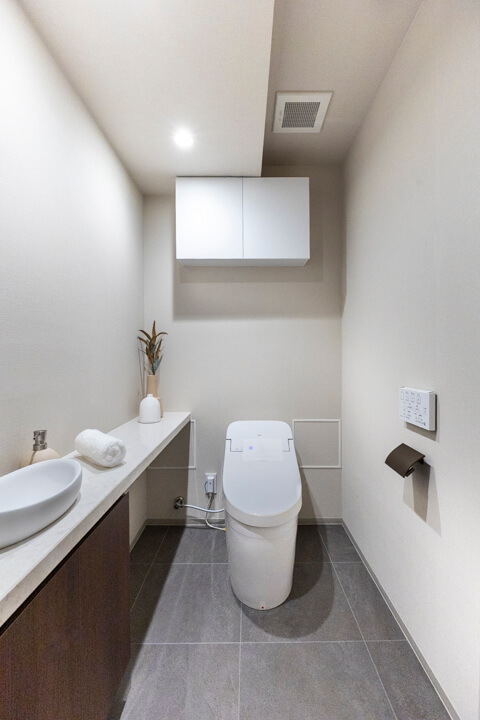 廊下に面していて独立性の高いレストルーム。TOTO製の洗浄機能付トイレに交換済みです。ホテルライクな手洗いカウンター付きなのが嬉しいポイント。すぐに手を洗うことができ、ゲストを洗面室まで案内する手間もかかりません。トイレットペーパーや掃除用品は吊戸棚にすっきり収納してくださいね。