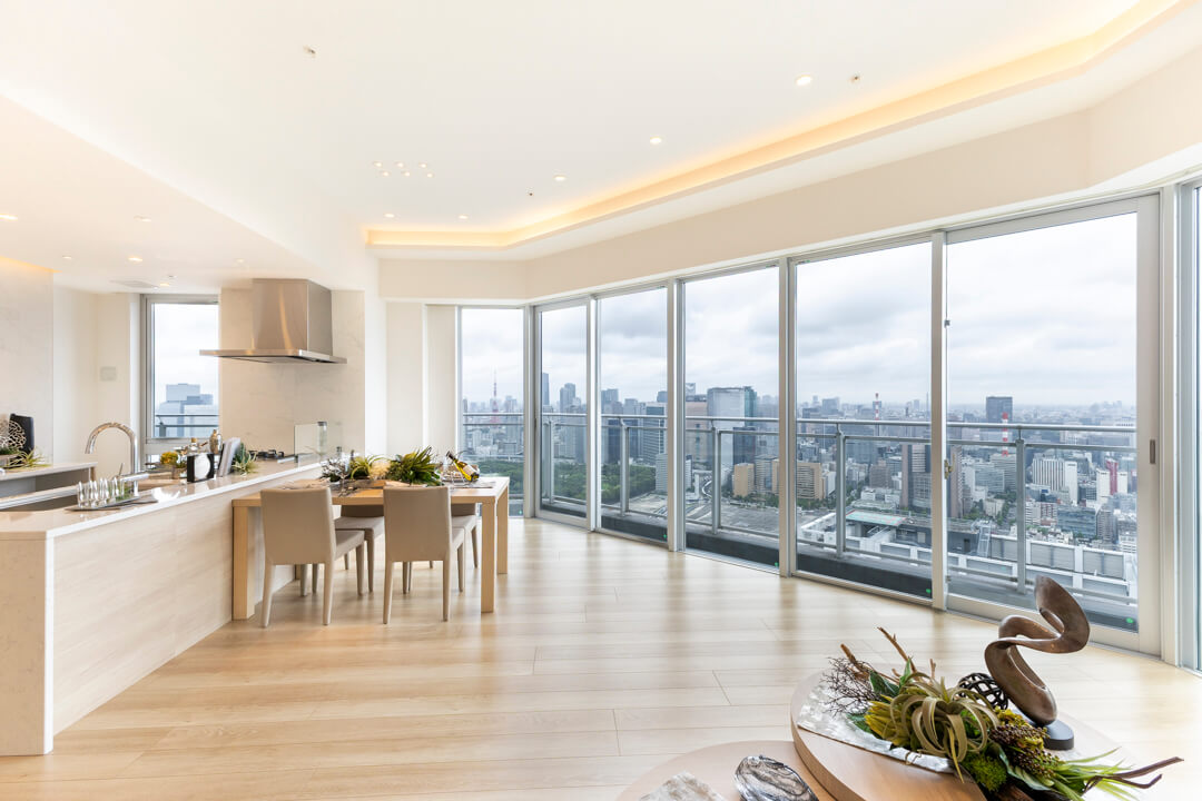 大開口の窓が並び、開放感溢れるリビングダイニング。東京タワーや浜離宮恩賜公園の緑を望む、贅沢な眺めを堪能できます。ライトアップも楽しみですね。折り上げ天井には間接照明が施され、柔らかな光のグラデーションがリラックスタイムへ誘ってくれます。