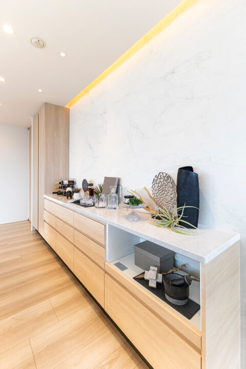 大理石貼りで高級感の漂う玄関・廊下。折り上げ天井に施された間接照明も印象的です。SIC(シューズインクローゼット)と収納棚を完備していて収納豊富◎。自由度の高い可動棚なので、ロングブーツや傘などもすっきり収納できそうです。廊下にはダウンライト付きのインテリアスペースがあり、お花や小物を飾って空間づくりを楽しむことができます。