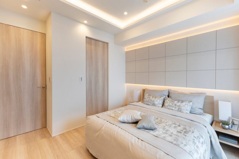 LDKに接続する洋室1。バルコニー付きで奥行きを感じる空間です。間接照明のやわらかな明かりがリラックスタイムへ誘ってくれそうですね。WIC(ウォークインクローゼット)完備で収納力があり、居室空間を広々と使えそうです。