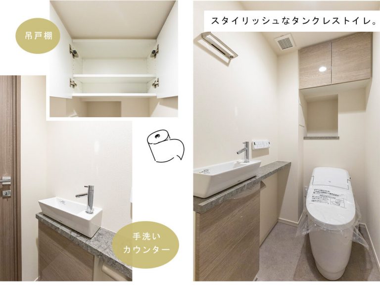 廊下に面していて独立性の高いレストルーム。LIXIL製の洗浄機能付トイレを採用しています。タンクレス仕様でスタイリッシュ。手洗いカウンター付きなのですぐに手を洗うことができ、ゲストを洗面室まで案内する手間もかかりません。背面にはトイレットペーパーや掃除用品の収納に便利な吊戸棚、ディフューザーやお花を置けるニッチカウンターを完備しています。
