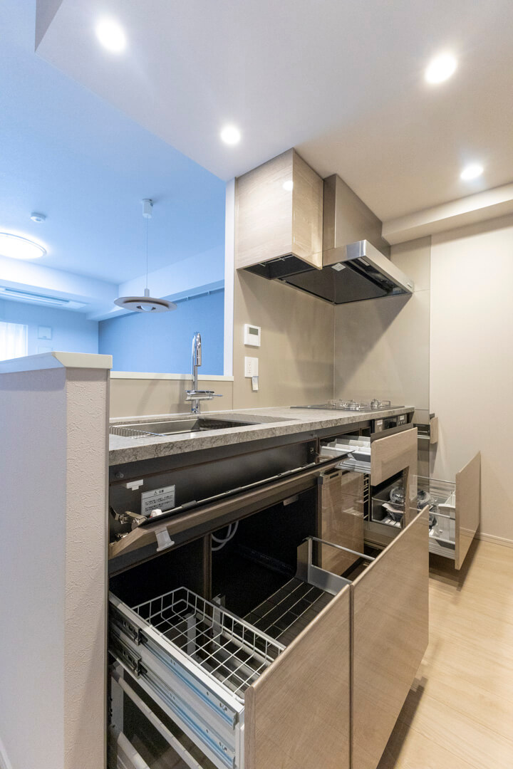 効率良く調理ができるグリル付3口ガスコンロや、後片付けの捗る食洗機を内蔵。さらに、シンクにはディスポーザーが付いています。料理後すぐに生ゴミを処理できるので、掃除の手間が軽減され、悪臭の原因を防いでくれます。