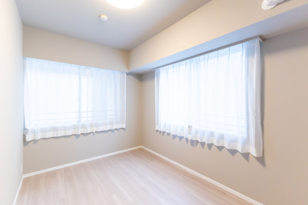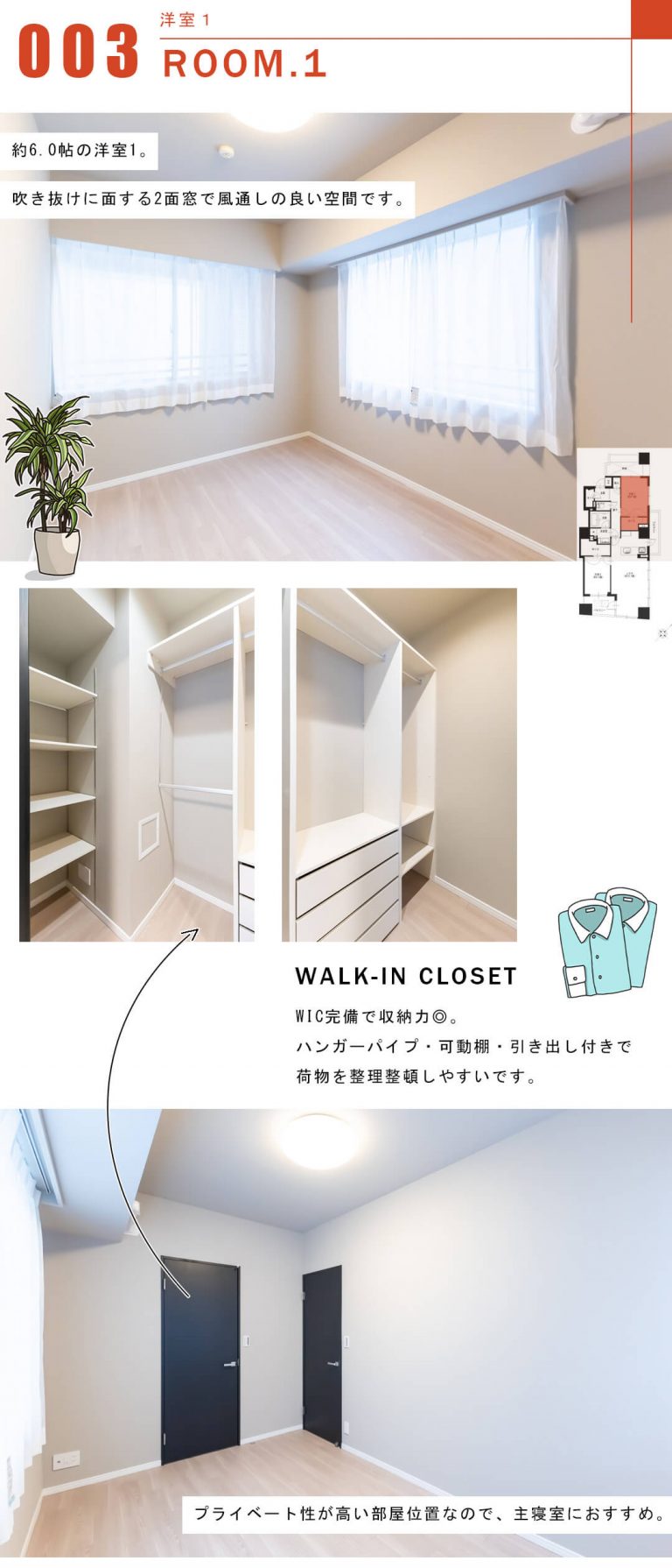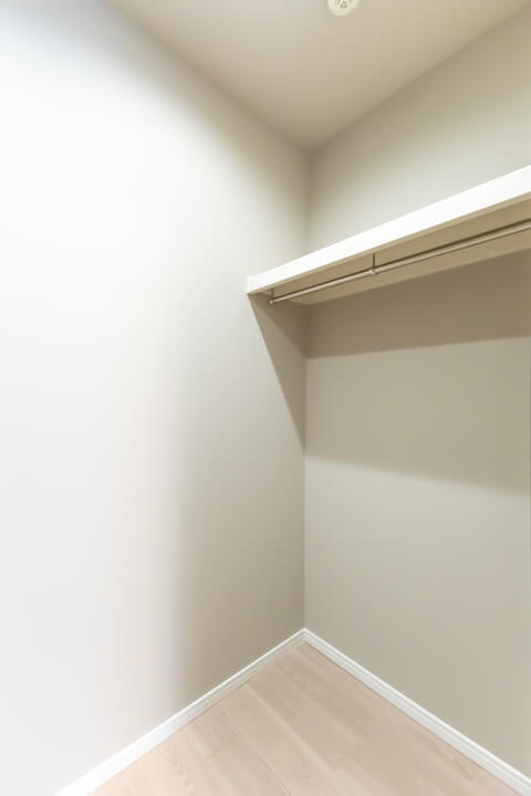 LDKに隣接する約5.6帖の洋室2。南東向きバルコニーに面していて、自然光がたっぷり入る空間です。こちらのお部屋にもWIC(ウォークインクローゼット)があり、収納豊富◎。衣類はもちろん、トランクケースやゴルフバッグといった大きな荷物も収納でき、居室空間を広々と使うことができます。
