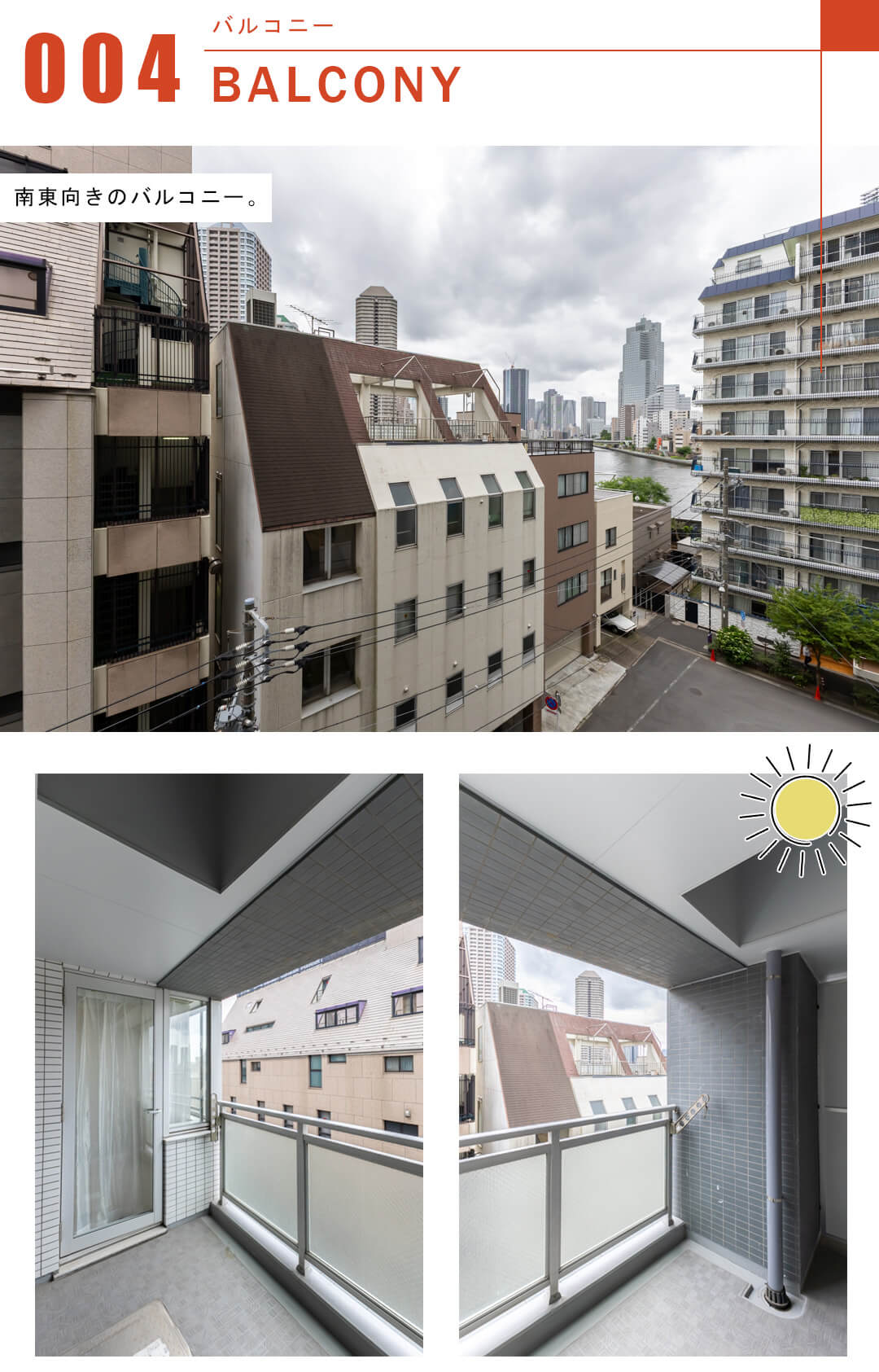 2003年2月竣工、タイル張りのスタイリッシュな外観が印象的な14階建マンション。JR京葉線「八丁堀」駅より徒歩5分、近くに隅田川が流れる角地に立地しています。東京メトロ日比谷線「八丁堀」駅・東京メトロ東西線「茅場町」駅も徒歩圏内で都内主要駅へのアクセス良好です。お部屋は5階部分、専有面積70㎡の2LDK。南東・北東角部屋につき、明るい光と心地よい風が届きます。2つのWICやSICなど、豊富な収納も魅力的。リビングには床暖房が敷設されていて、愛犬・愛猫と癒しの時間を過ごせそうです。