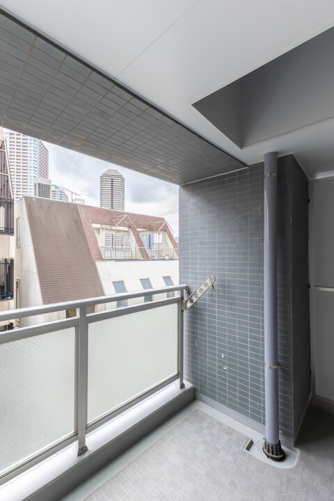 LDKと洋室2に接続するバルコニー。9.89㎡です。撮影日はあいにくのお天気でしたが、南東向きのため、晴れの日にはあたたかい光が届きそうです。