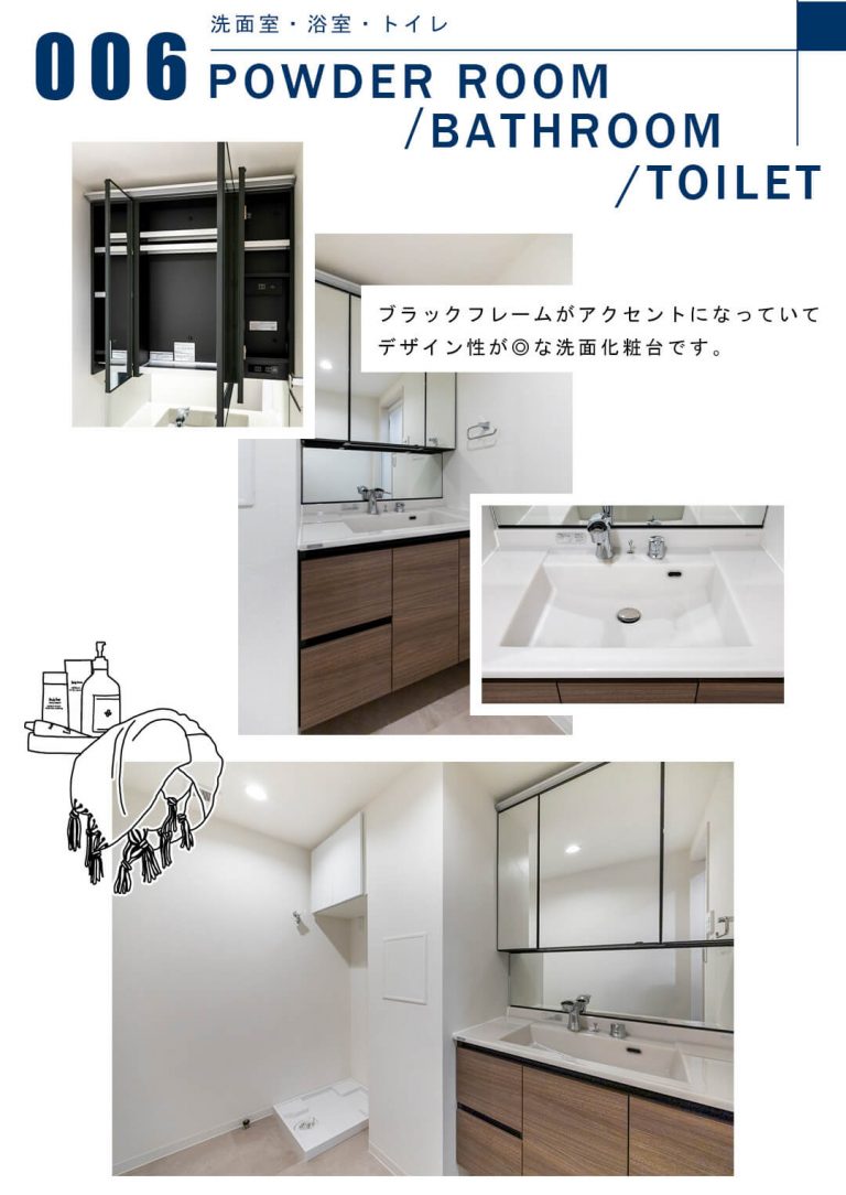 LIXIL製の洗面化粧台は、ブラックフレームがアクセントになっていてデザイン性が◎。三面鏡は中に化粧品などの小物が収納できるようになっているので使い勝手良好です。また、洗面ボウルとカウンターが一体型になっているのでお掃除が簡単です。