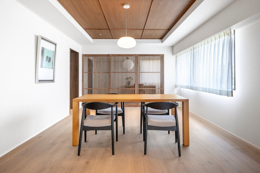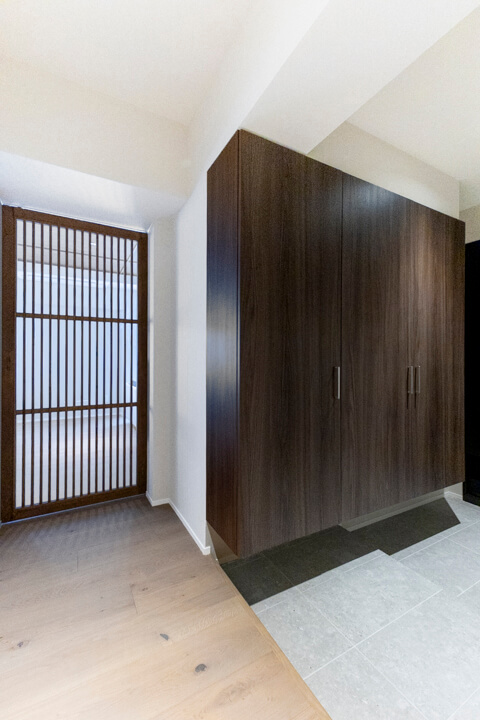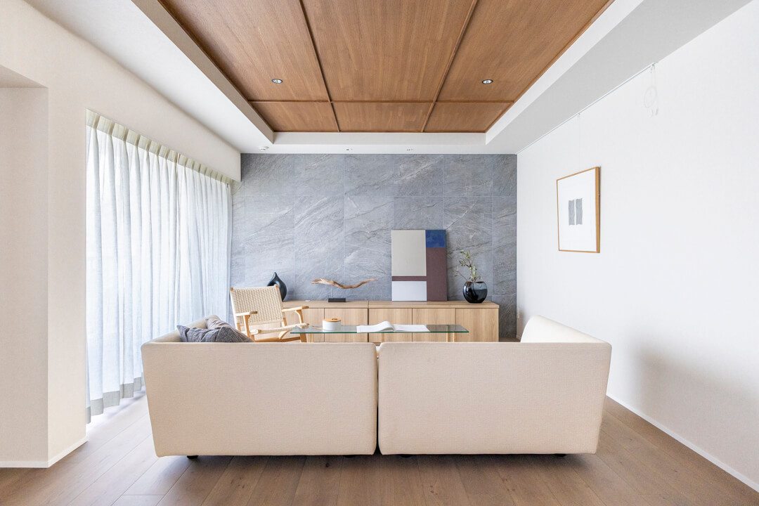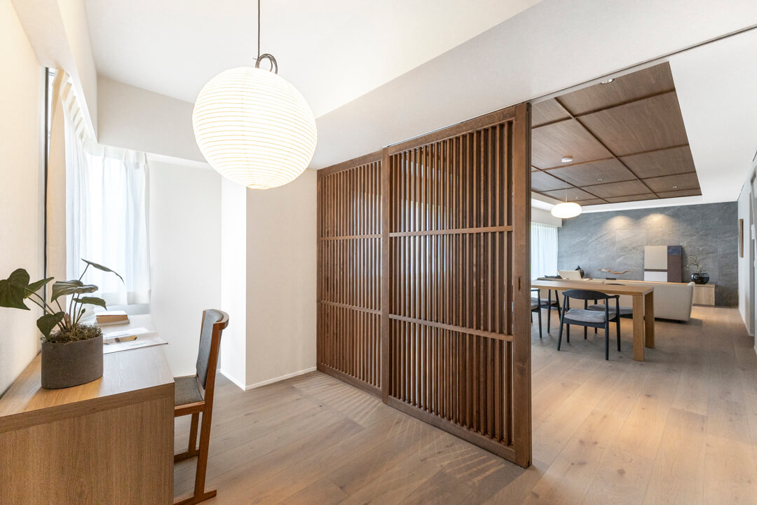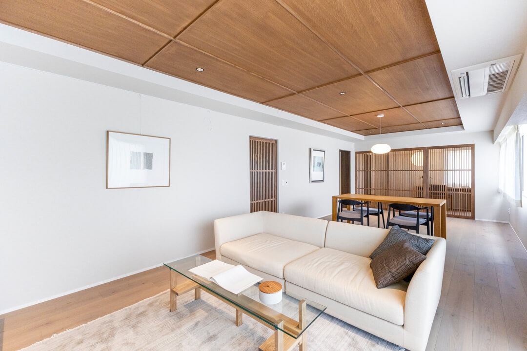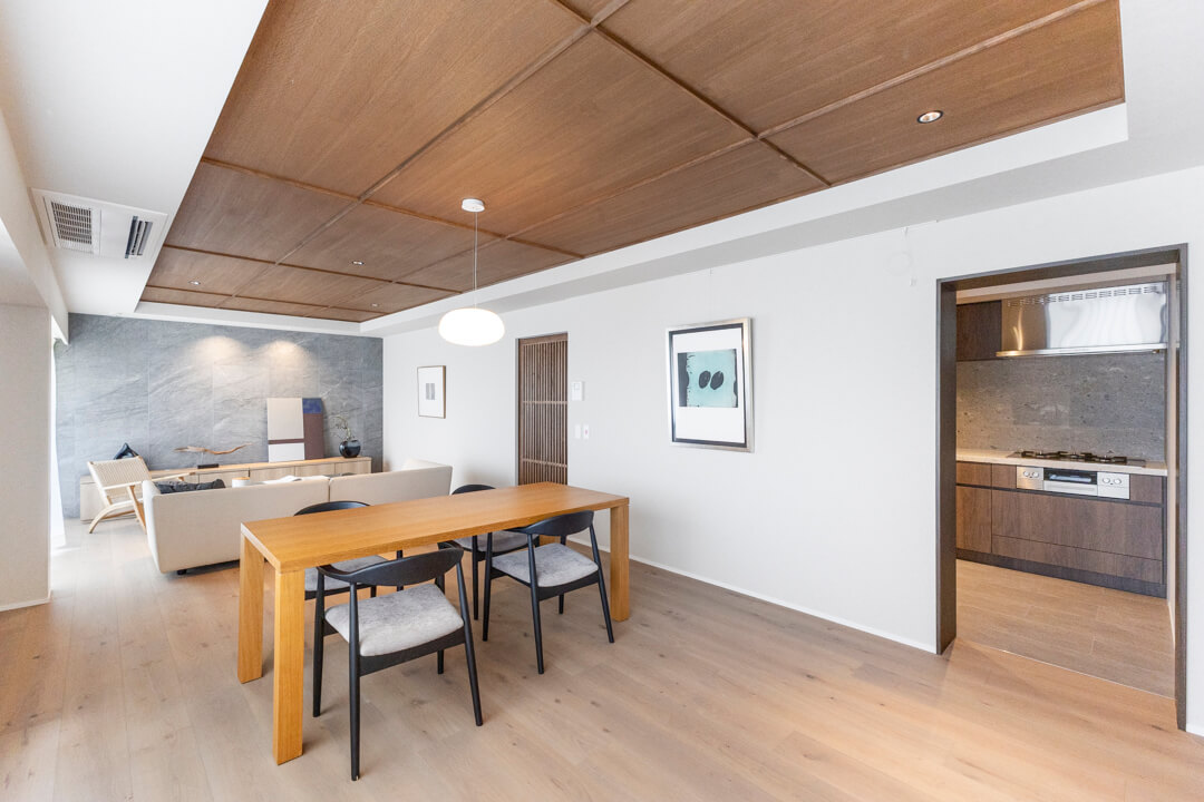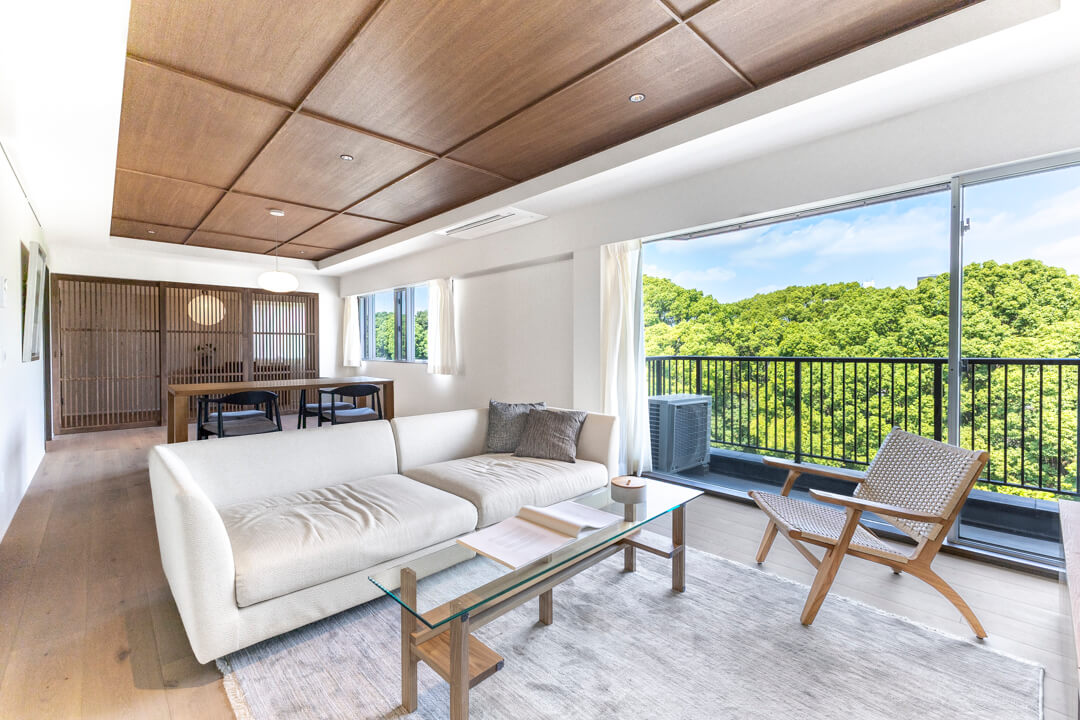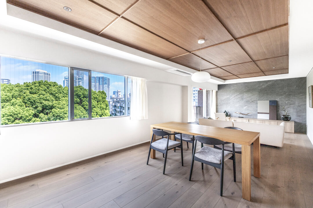 約27.4帖の広々としたLDK。大きな窓からは「高輪皇族邸」の豊かな緑を望むことができます。木の質感を楽しめる挽板フローリングや石目調タイルを採用した上質な空間に、緑の風景が調和しています。天井にも同じ材質を使いながらダークトーンに仕上げることで、空間にアクセントを。フローリング&天井に濃淡をつけることや大判のフローリング板で洋風の要素、格子戸で和のテイストを加えています。新旧の文化が入り混じるエリアに合わせ、「和洋折衷」をコンセプトにした内装です。