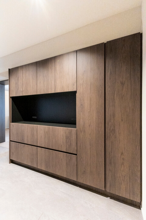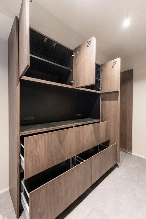 背面には収納力のあるカップボードを完備。キッチンと同じデザインで統一感があります。食料品のストックや食器類を整理整頓でき、ごちゃごちゃしがちなキッチンまわりがすっきり片付きそうです。