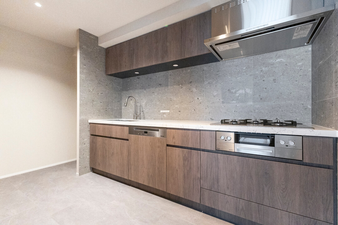 石目調のタイル貼りで重厚感の漂うキッチン。調理に集中でき、生活感を目隠しできる独立タイプです。調理中のにおいが生活スペースに広がりにくいのも嬉しいですね。幅2800mmのワイドタイプで、作業スペースが広く確保されているのもポイントです。