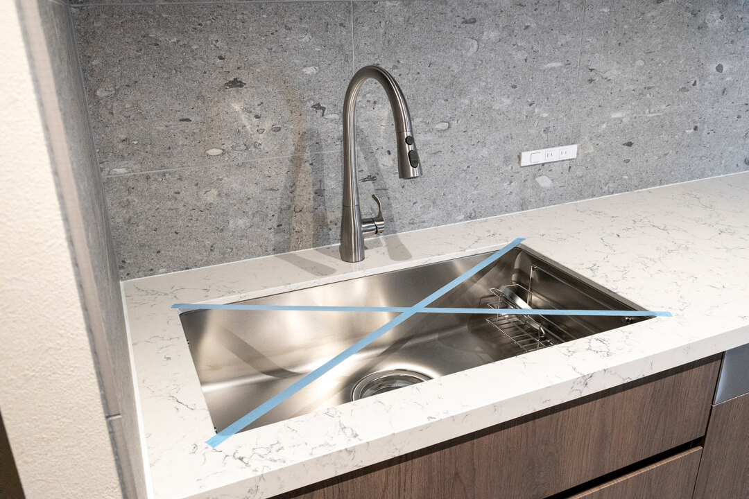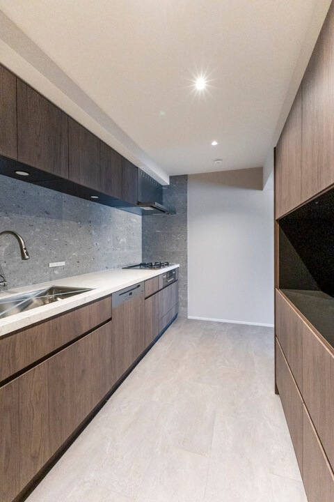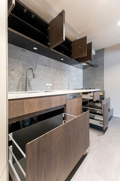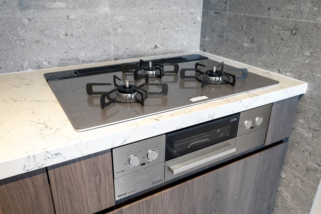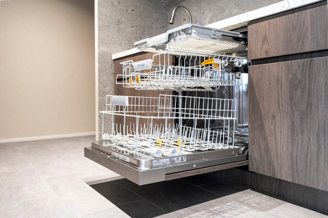 効率良く調理ができるグリル付3口ガスコンロや、料理の際に手軽においしい水を使用できる浄水器一体型水栓を完備。さらに、Miele(ミーレ)製の食洗機が内蔵されています。容量の大きさが魅力的で、後片付けの時短が叶います。