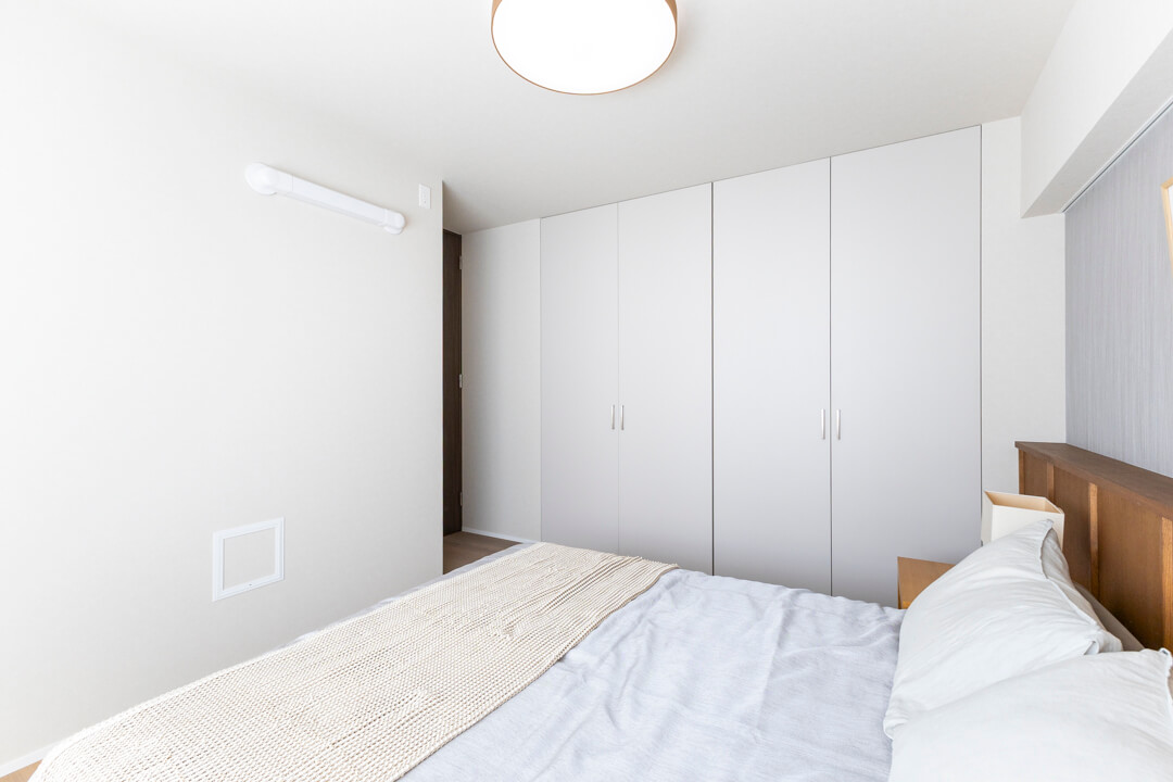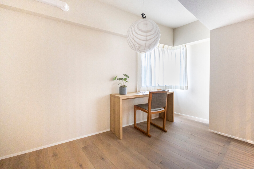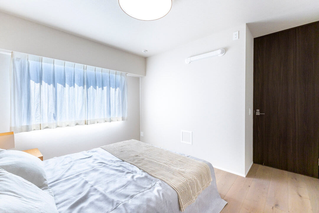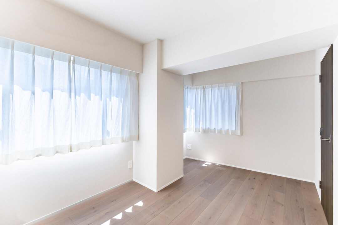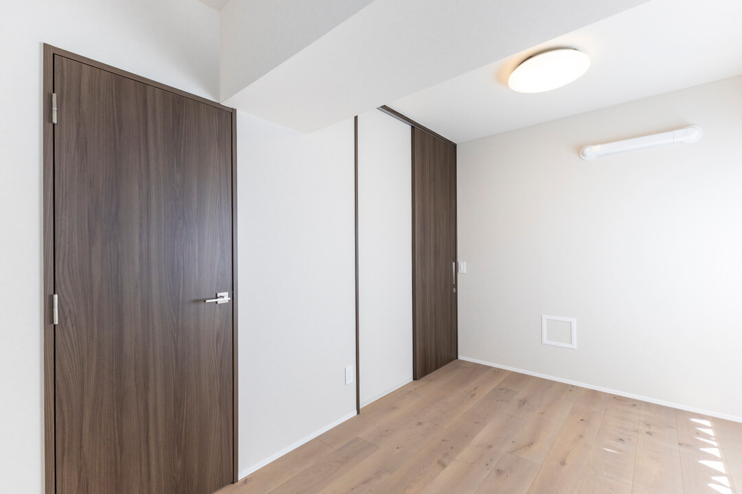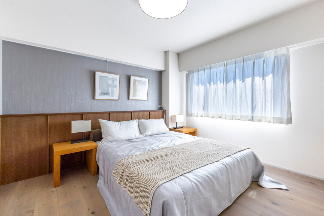 約7.5帖の洋室1。洋室で最も広く、主寝室にぴったりです。南東向きの窓から明るい光が入り、すっきり目覚められそうですね。木の腰壁の上部に金糸を織り込んだクロスが施され、質感を楽しめる洗練された内装が印象的。キングサイズのベッドを配置しても余裕のある空間で、ゆっくり休んでください。