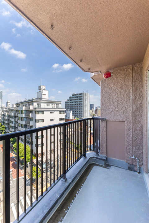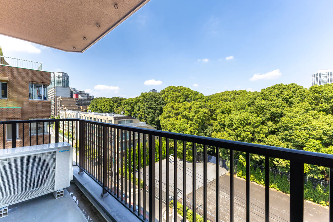 LDKに接続するバルコニー。遠く広がる青空と、こんもり茂った緑のコントラストが美しい眺めです。視界も抜けていて、ほっと一息つける場所になりそうですね。マンションの規約上、バルコニーに物干し金具等を設置することはできないので、物干しに関してはランドリールームや屋上の洗濯物干し場、浴室乾燥機などをご利用ください。