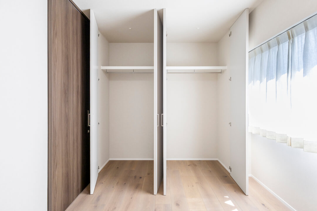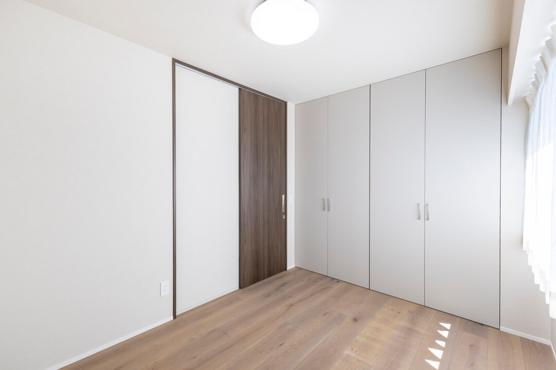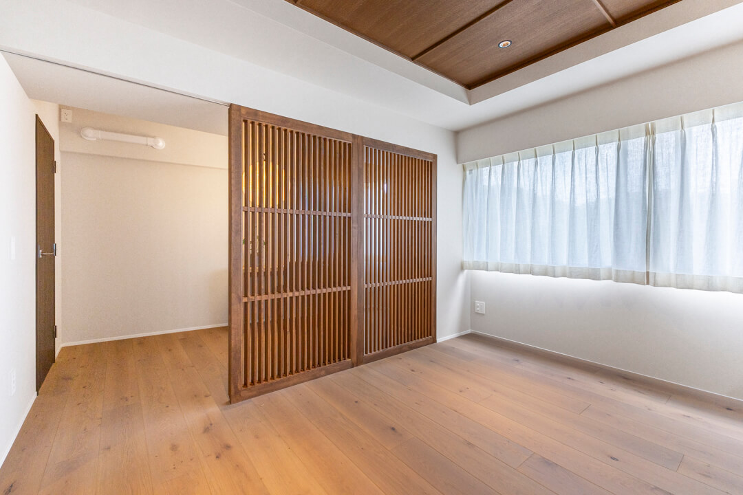LDKに接続する洋室4。約5.1帖です。格子戸を採用していて、和のテイストを感じる空間。ほど良いこもり感があり、ワークスペースや趣味部屋におすすめです。WIC(ウォークインクローゼット)完備で収納性の高さも魅力的。ハンガーパイプ&可動棚付きで使い勝手が良く、リビング収納として活躍しそうです。