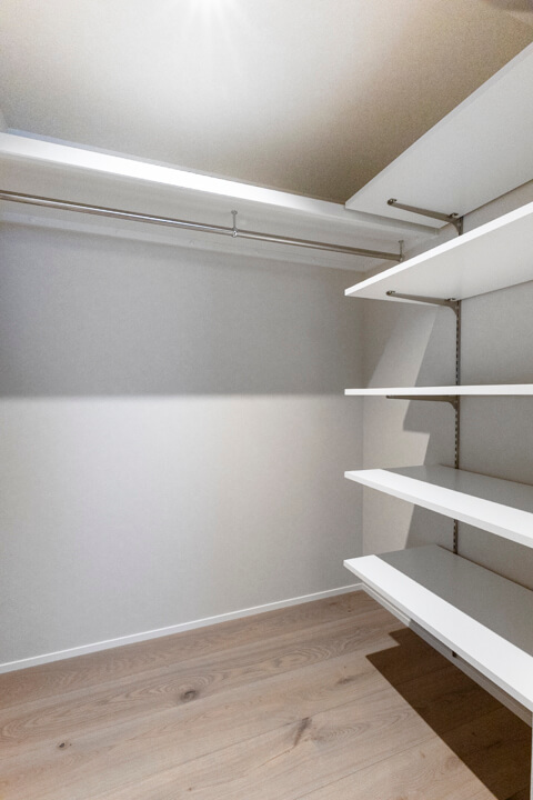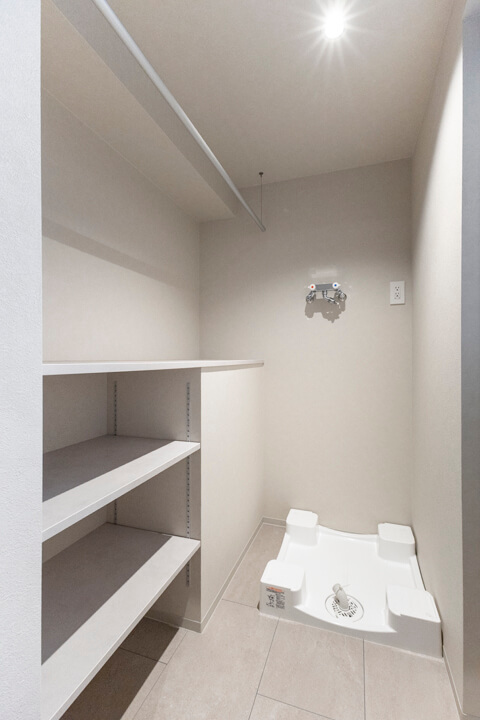 洗面室とは別に、ランドリールームが用意されています。洗濯機パンと可動棚、カウンター、ハンガーパイプが付いていて使い勝手の良い空間です。ゲストが来た時に生活感が出る部分をカバーできて◎。コンパクトなバルコニー付きで自然換気できるのも嬉しいポイントです。