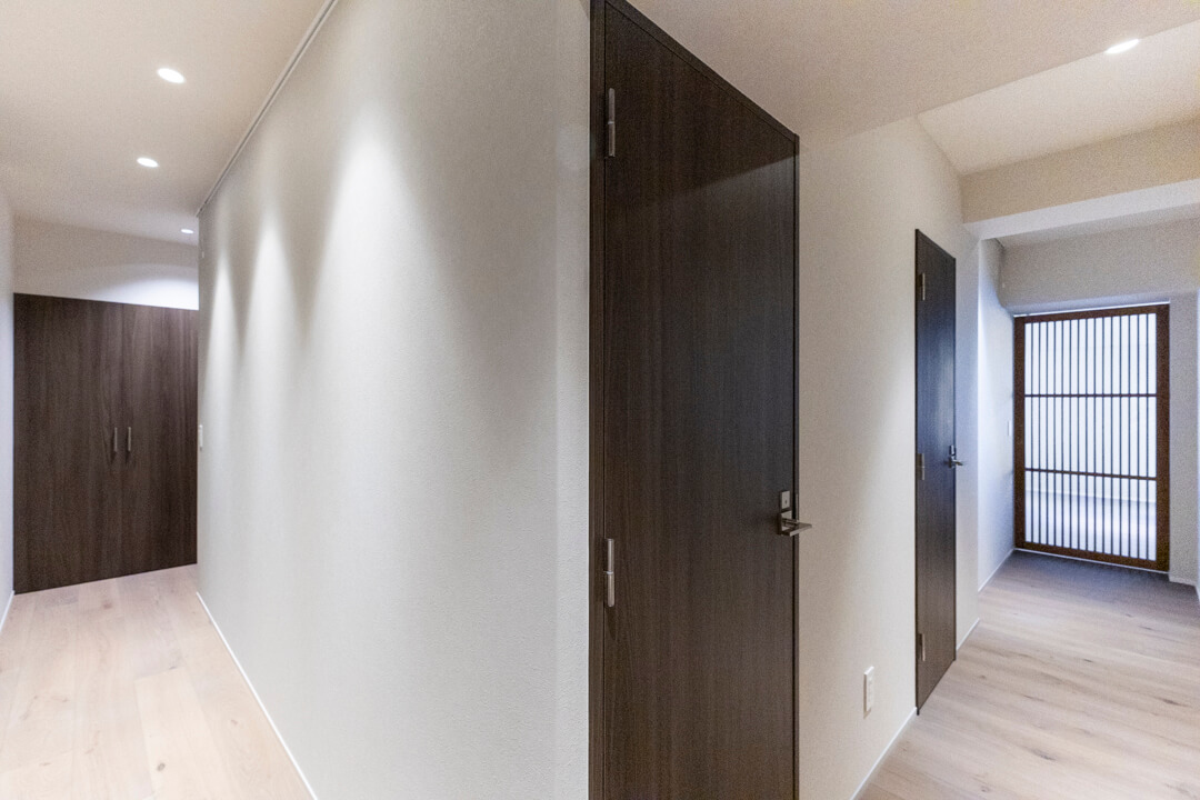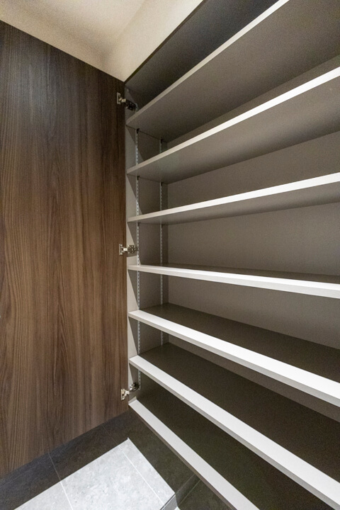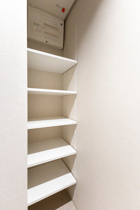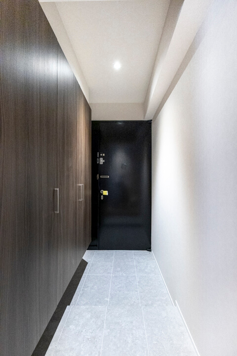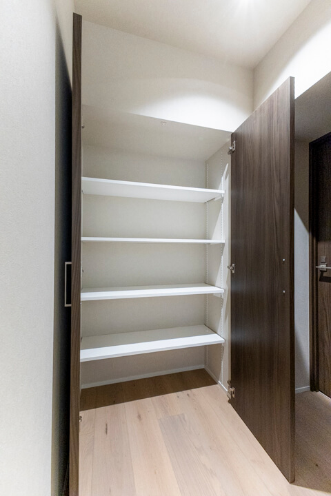 トールタイプのシューズボックスがあり、収納豊富な玄関。自由度の高い可動棚で、散らかりがちな靴をすっきり収納できます。いつも清潔な玄関でお出迎えできそうですね。廊下の突き当たりにも収納があり、日用品ストックや掃除道具の収納に重宝しそうです。