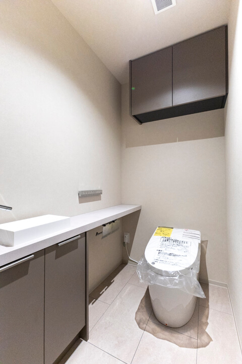 廊下に面していて独立性の高いレストルーム。TOTO製の洗浄機能付トイレを採用しています。タンクレス仕様でスタイリッシュですね。手洗いカウンター付きなのですぐに手を洗うことができ、ゲストを洗面室まで案内する手間もかかりません。トイレットペーパーや掃除用品は吊戸棚に収納してください。