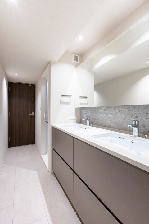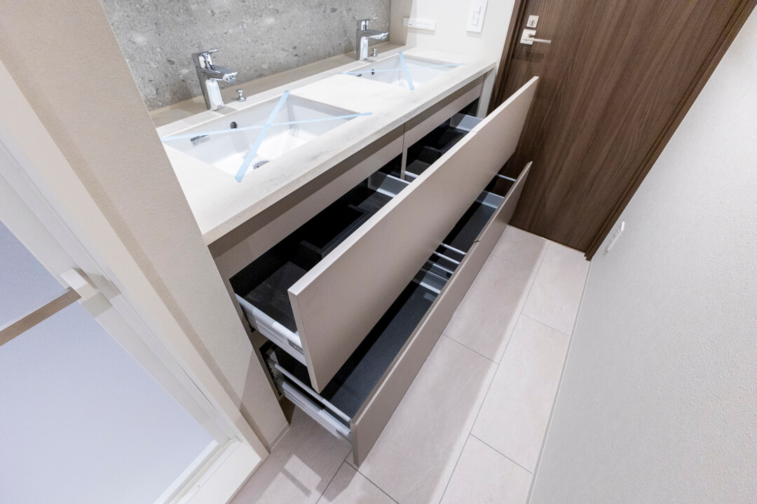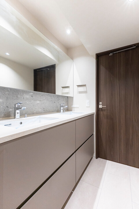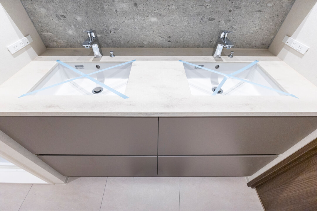 ホテルライクな2ボウルタイプの洗面化粧台。2人並んで使用でき、忙しい朝の身支度もスムーズに行えそうです。左右両方にコンセントが付いているのも嬉しいポイントです。
