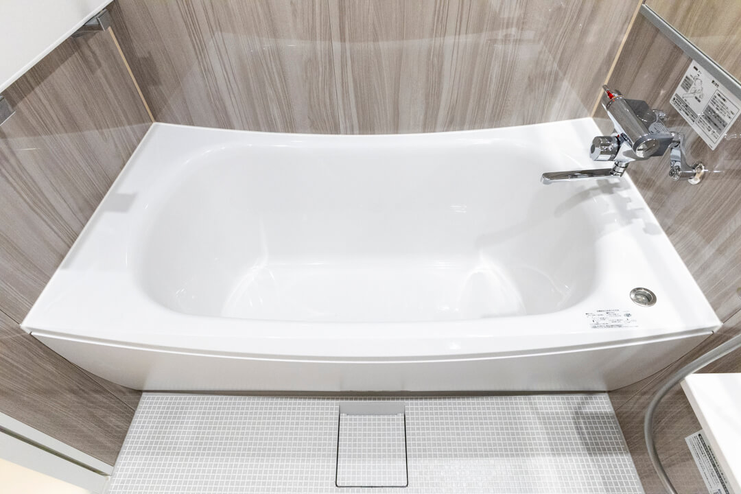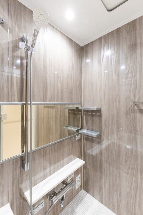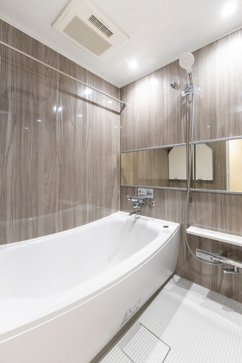 光沢のある木目デザインが洗練された雰囲気を醸し出すバスルーム。ワイドミラーが奥行きをもたらし、広々とした印象になります。換気・暖房・乾燥・涼風機能付きで1年中快適なバスタイムに。花粉が多い時期や雨の日の洗濯スペースとしても重宝しそうですね。