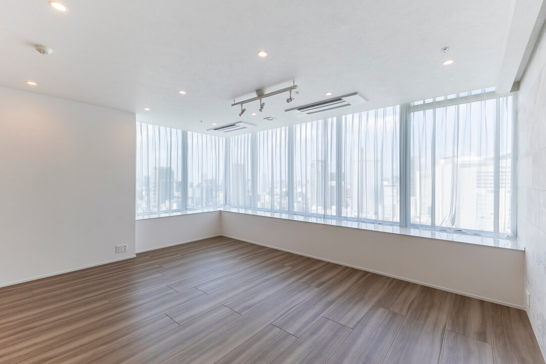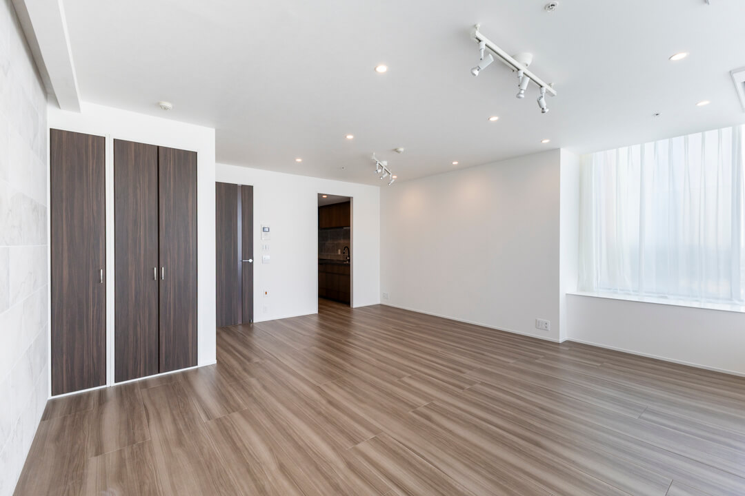 大開口の窓がスクリーンのように景色を映す、開放感溢れるリビングダイニング。約20帖の広々とした空間です。窓からは遠く広がる青空を見渡すことができ、日々の暮らしに癒しを与えてくれそうです。北東向きですが30階なので充分な光が届き、暑い夏も過ごしやすいですよ。