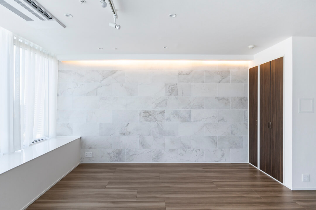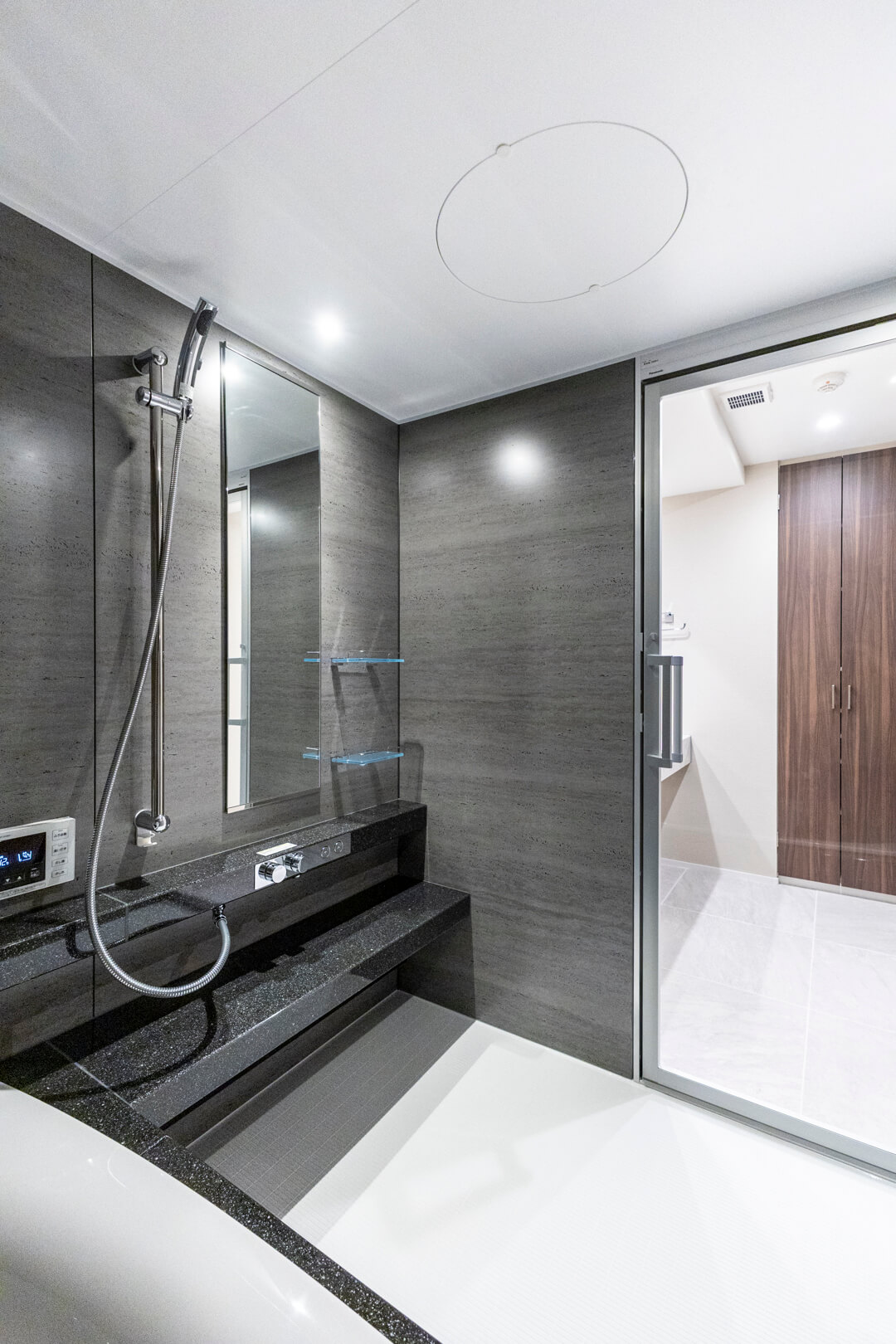 ストーンタイルがアクセントになり、上質な空間を演出。間接照明のやわらかなグラデーションがリラックスタイムへ誘ってくれます。エアコンにはスタイリッシュなビルトインタイプを採用しています。