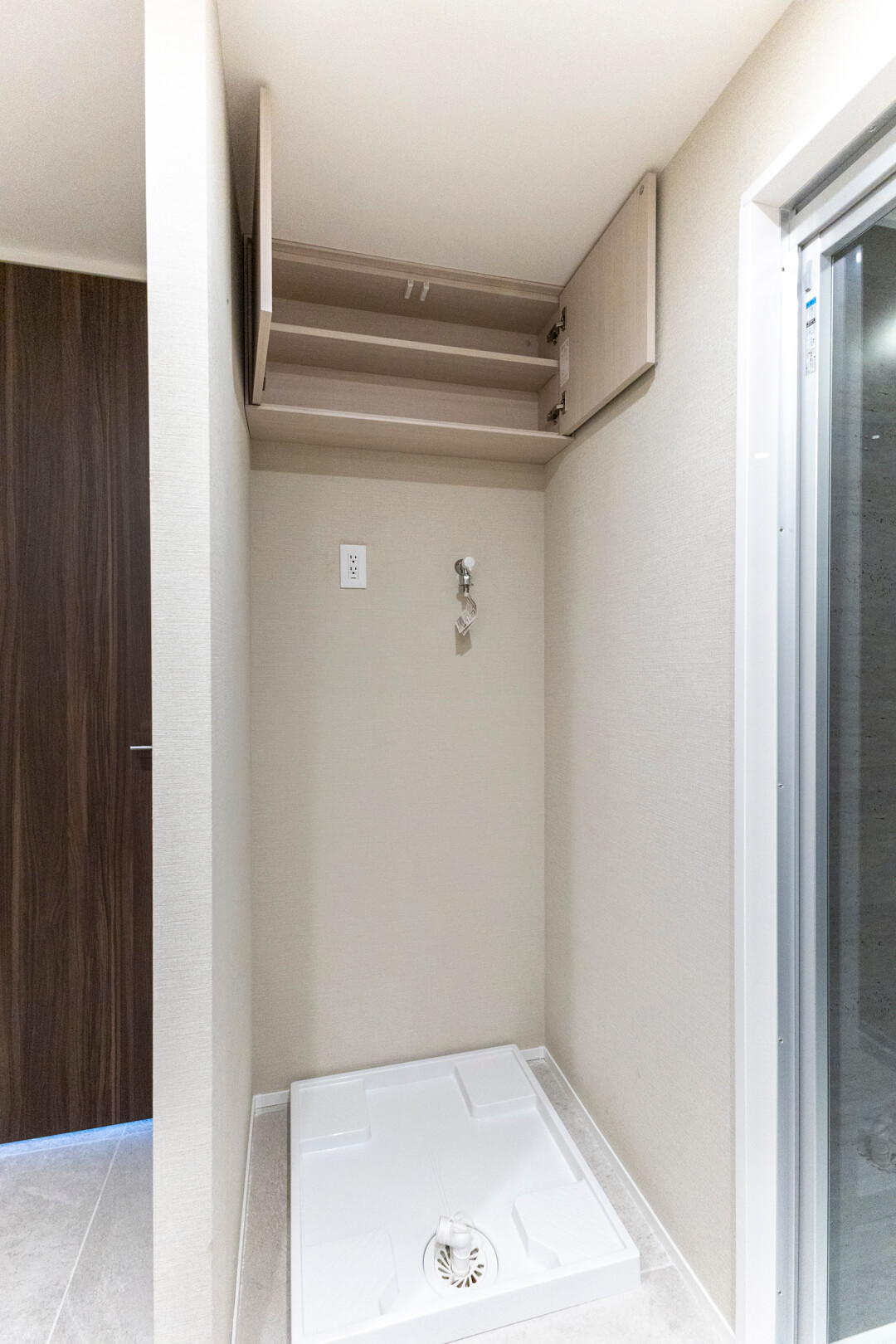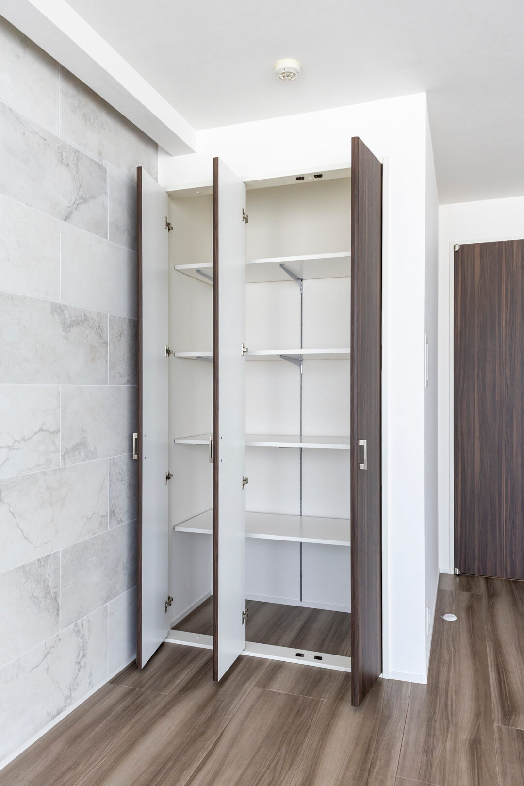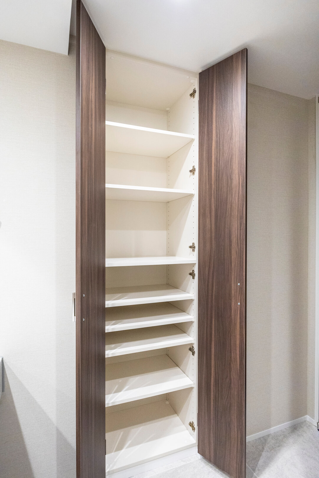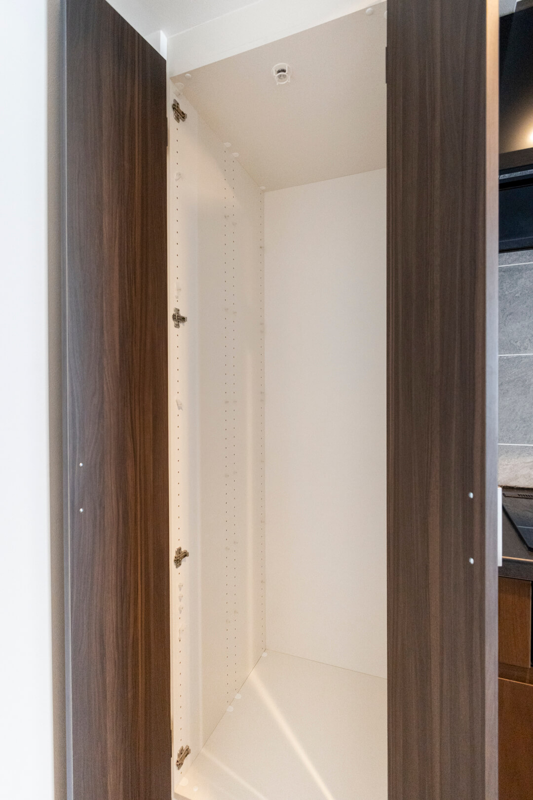 使い勝手の良い可動棚収納を完備。出し入れしやすい位置にあるので、使用頻度の高い日用品や掃除用品の収納に便利です。すっきり収納して、清潔なリビング空間をキープできそうですね。