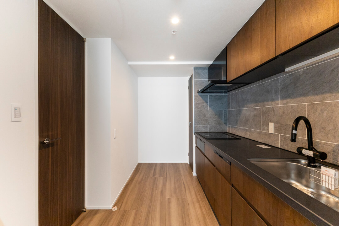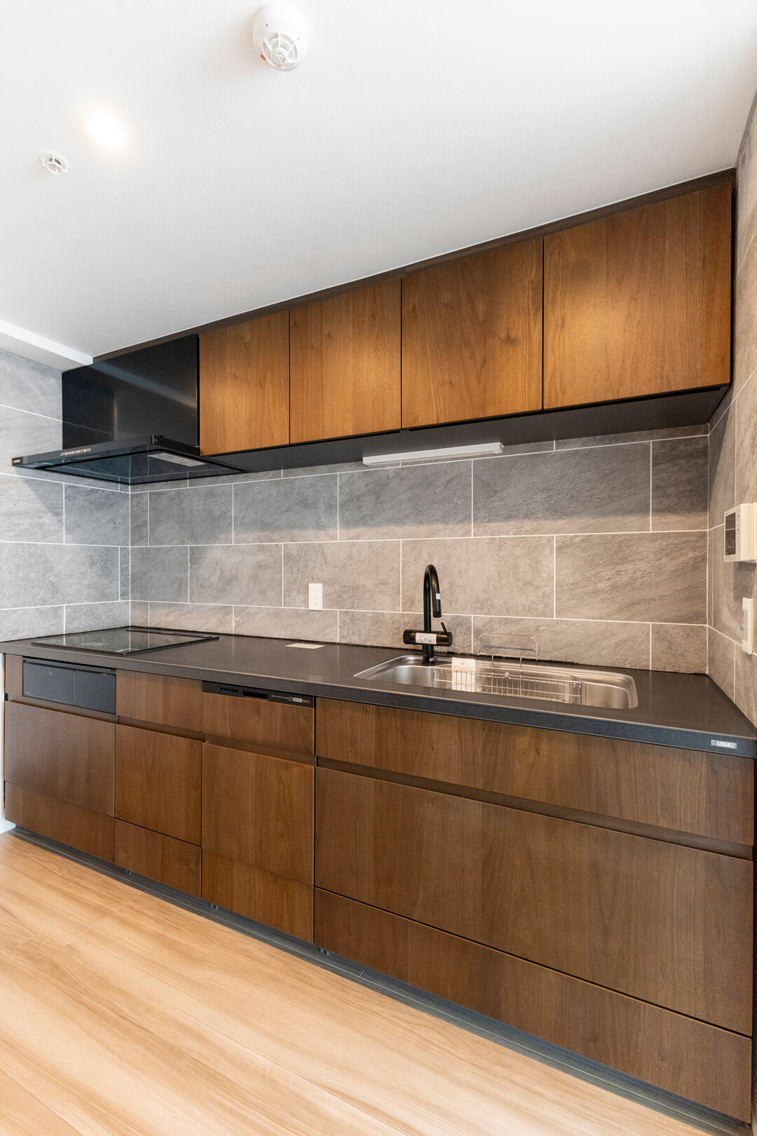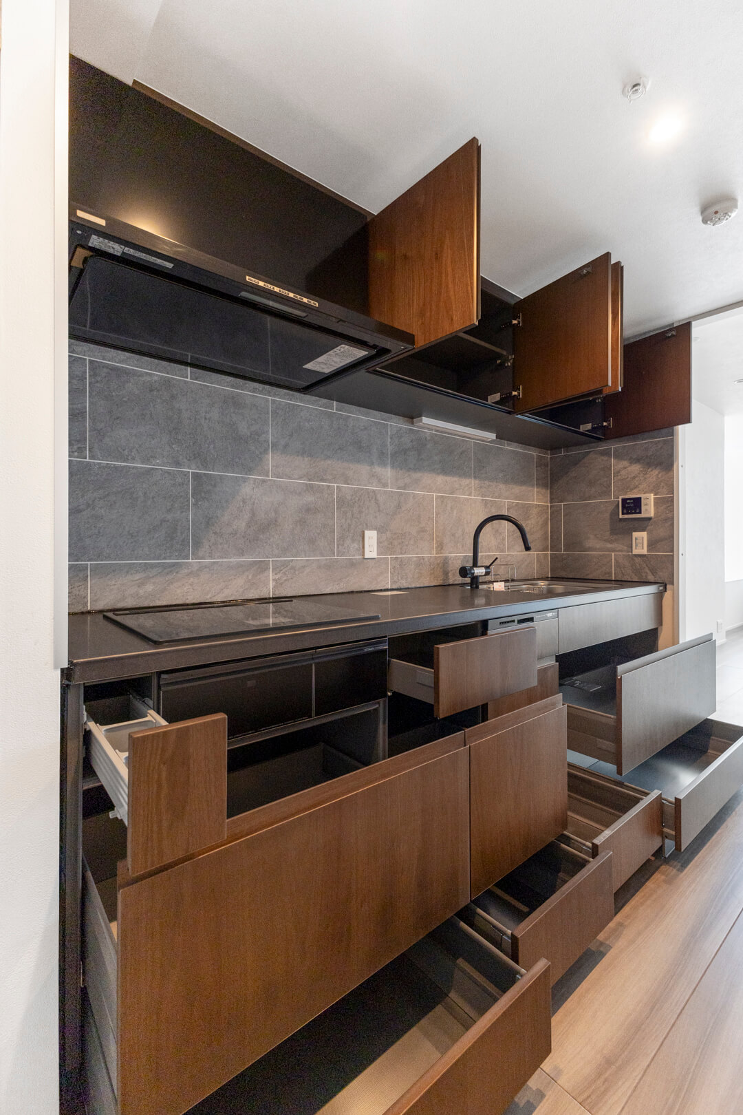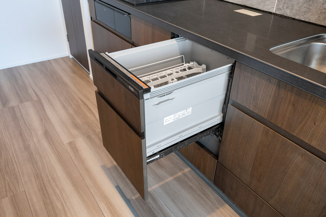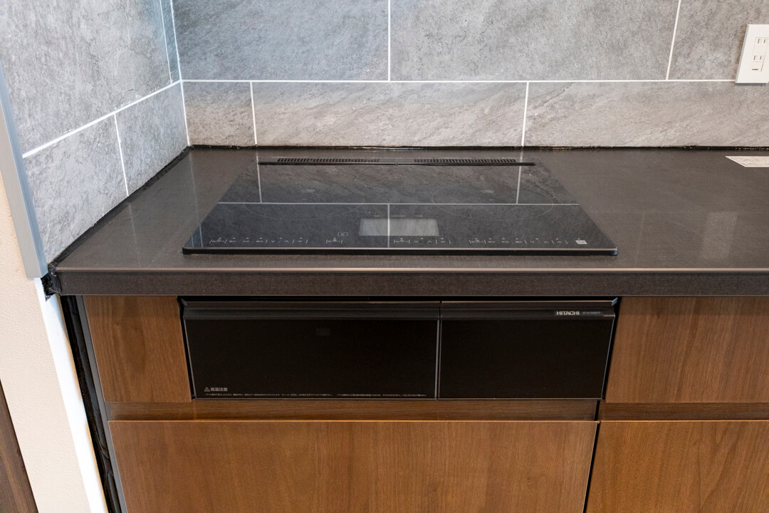 3口のIHクッキングヒーターや浄水器一体型水栓、食洗機を完備しています。調理も後片付けも捗りそうですね。IHはスイッチで火力を調節でき、ガスコンロよりも調整が簡単。凹凸がなくフラットでお手入れがしやすいのも魅力的です。