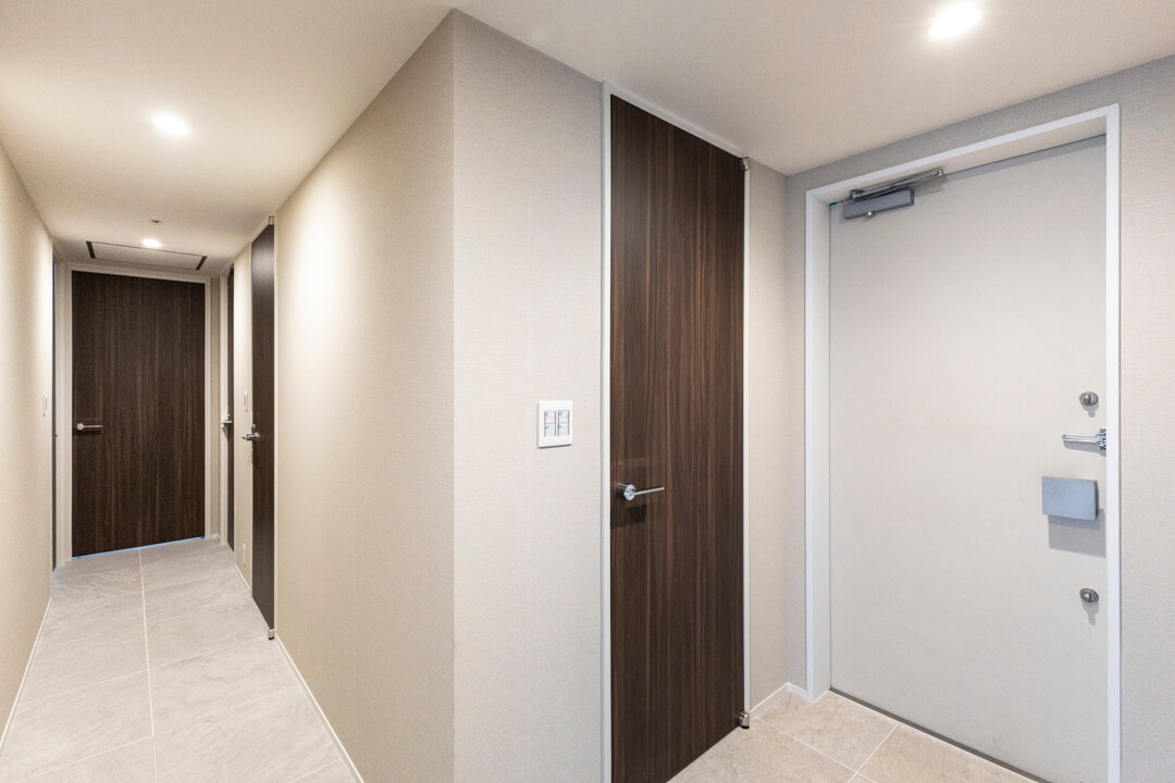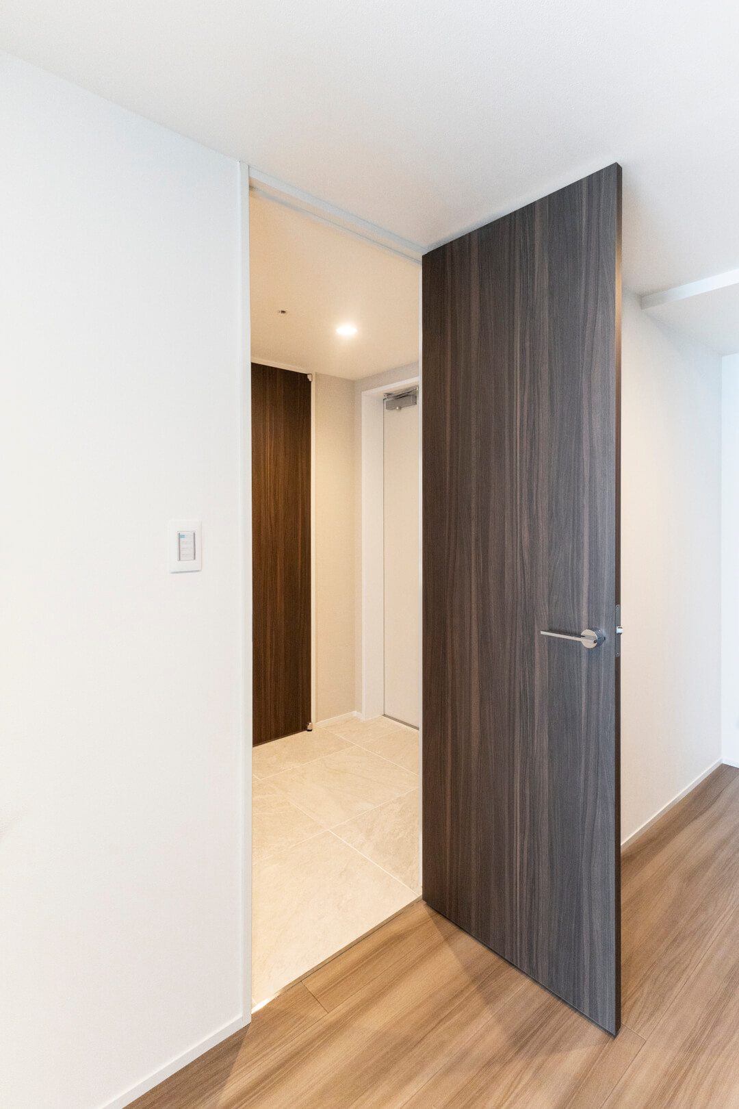 奥の扉からは廊下へ直通アクセス可能◎。買い物帰りにそのまま食材をキッチンに運ぶことができる便利な2way動線です。