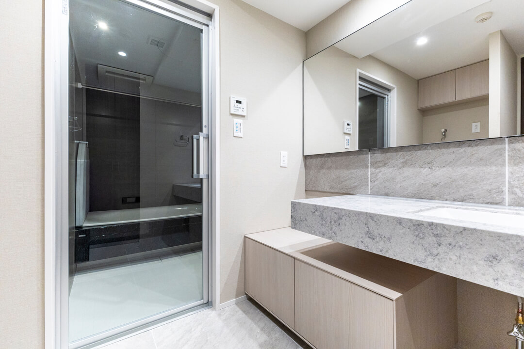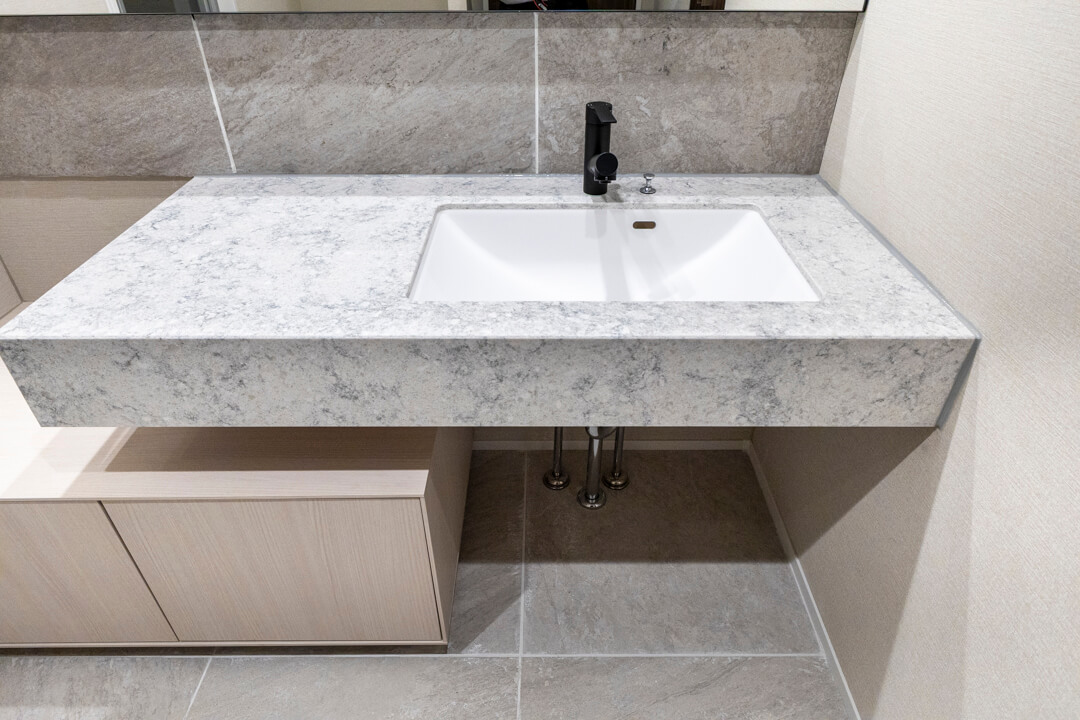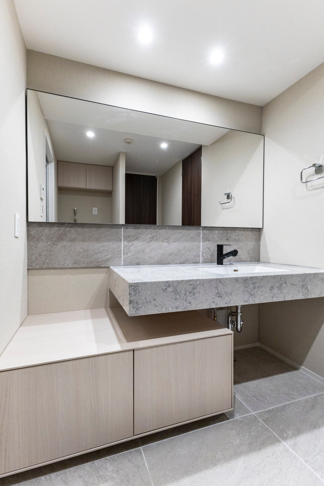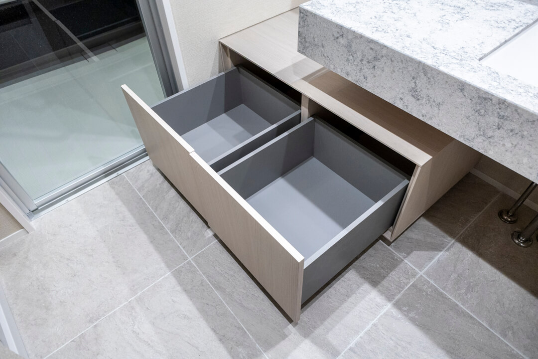 石目デザイン&フロートタイプで、ホテルライクな洗面化粧台。カウンタースペースにゆとりがあり、化粧品やドライヤーの仮置きができます。忙しい朝の身支度もスムーズに行えそうですね。カウンター下の引き出しやリネン庫付きで、タオルやシャンプーなどをすっきり収納できます。