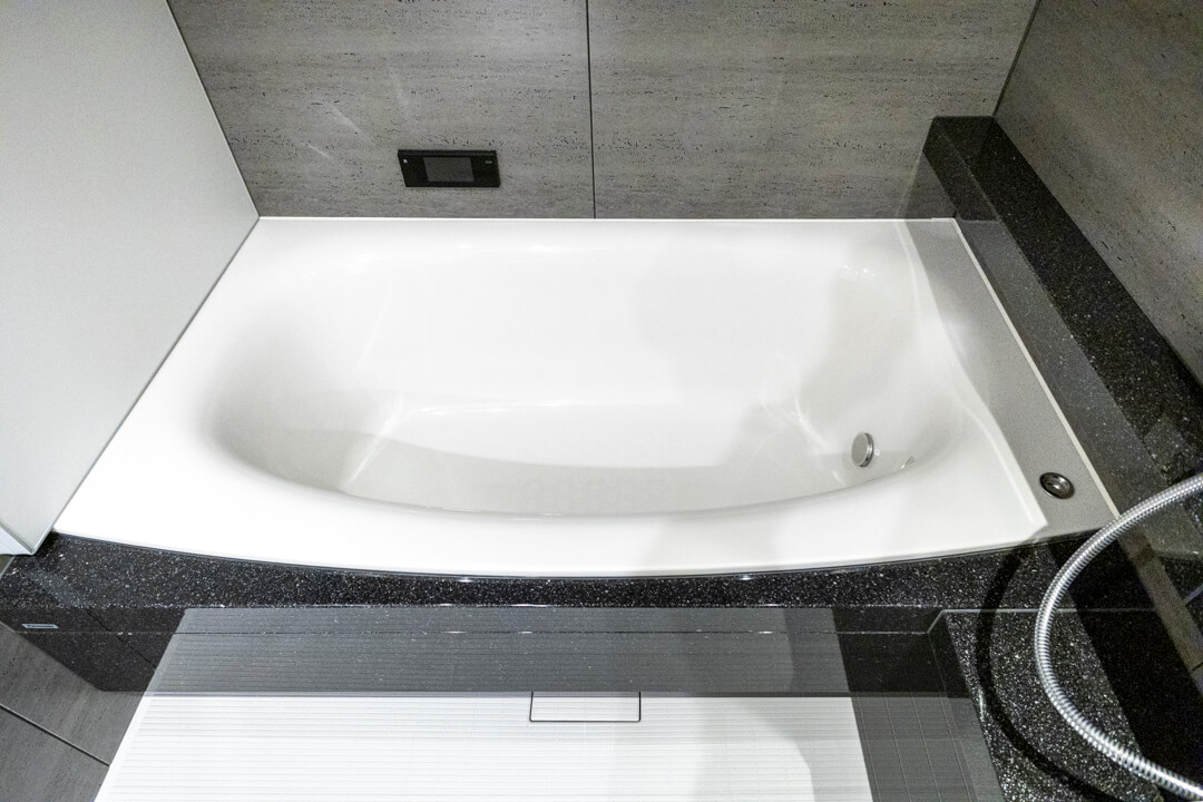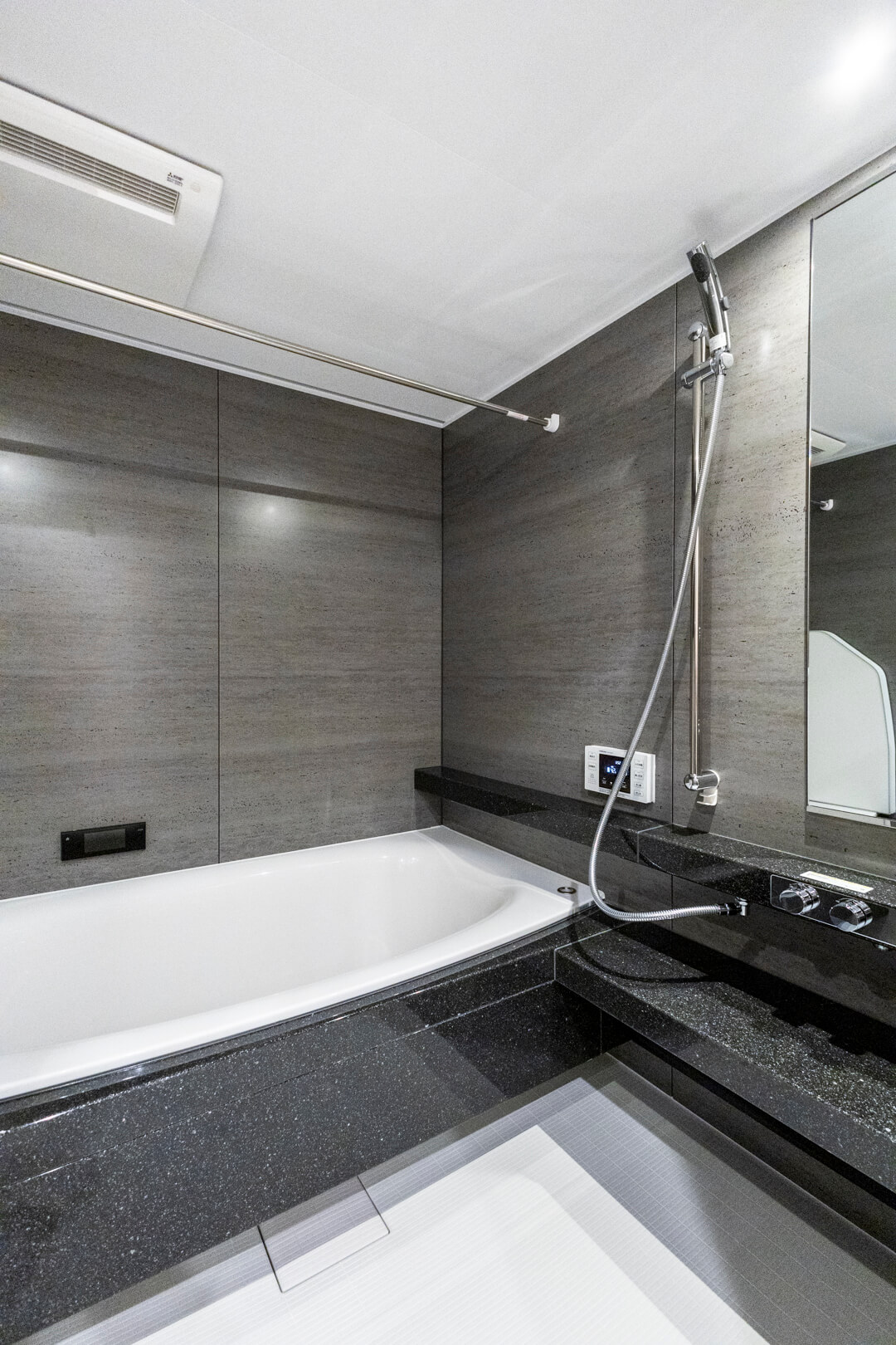 シックな内装で高級感の漂うバスルーム。換気乾燥暖房機・追い焚き機能搭載で1年中快適なバスタイムを過ごせます。丸みを帯びた浴槽が疲れた身体を包み込んでくれそうですね。保温性の高い風呂フタ付きなのも嬉しいポイントです。
