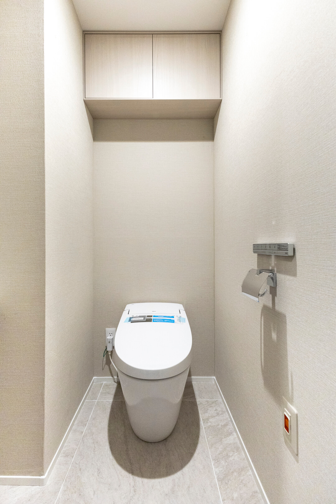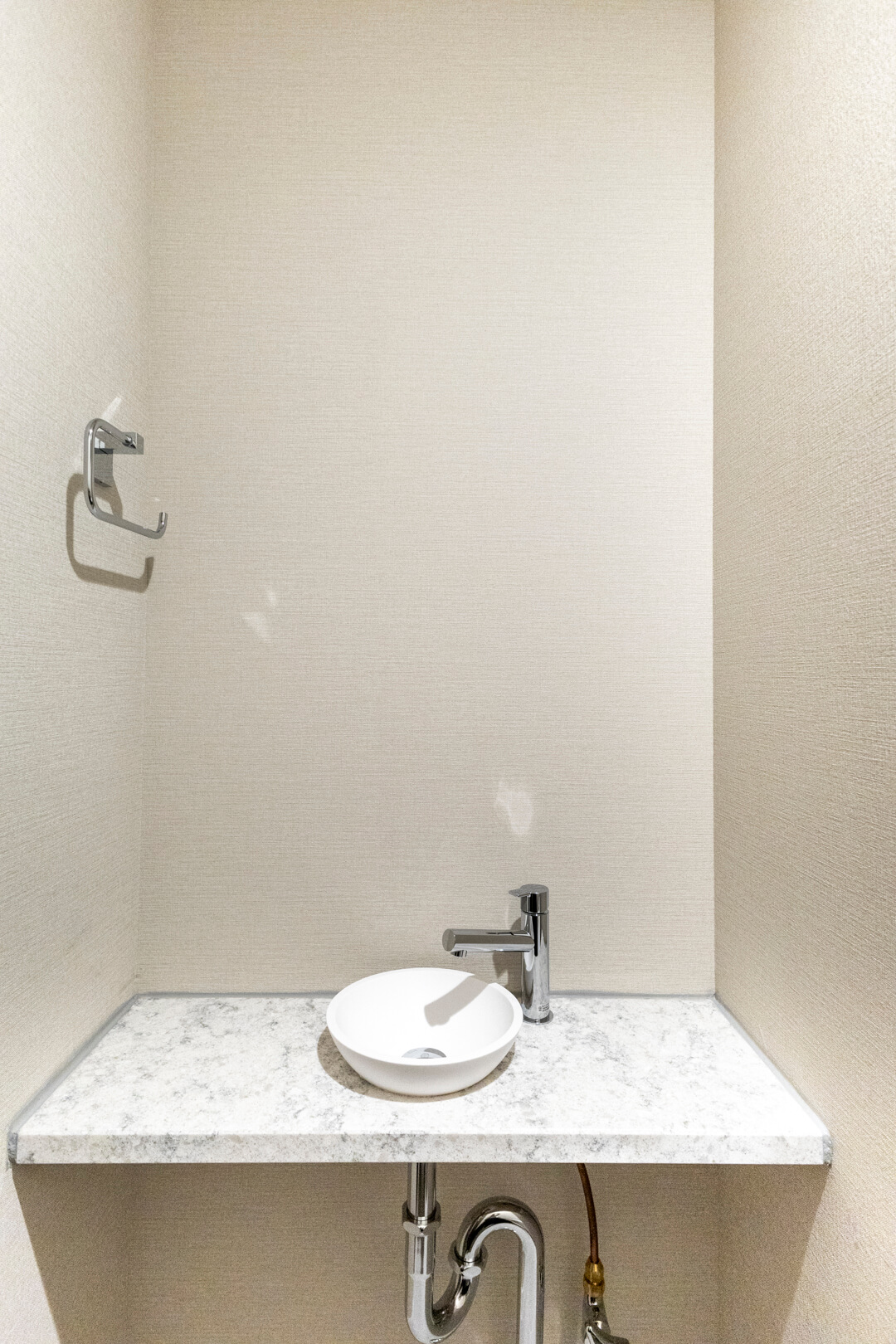 スタイリッシュなタンクレストイレ。LIXIL製の洗浄機能付きです。手前には便利な手洗いカウンターが設置されています。すぐに手を洗うことができ、ゲストを洗面室まで案内する手間もかかりません。トイレットペーパーや掃除用品は吊戸棚に収納してください。