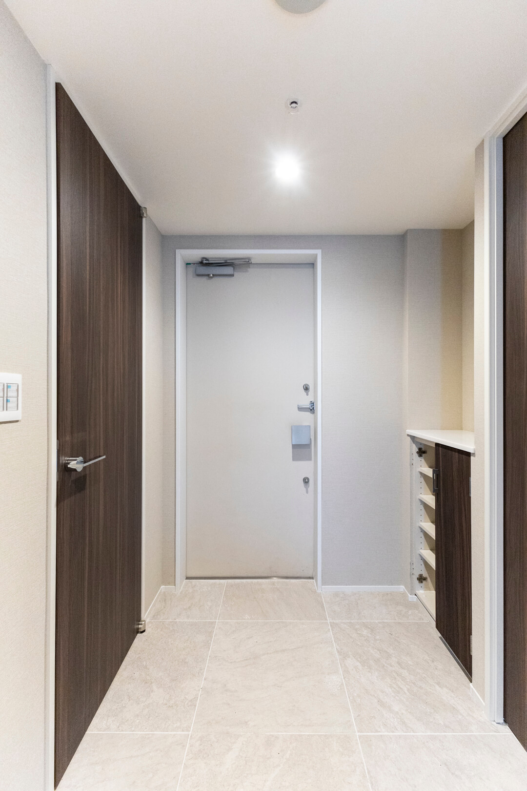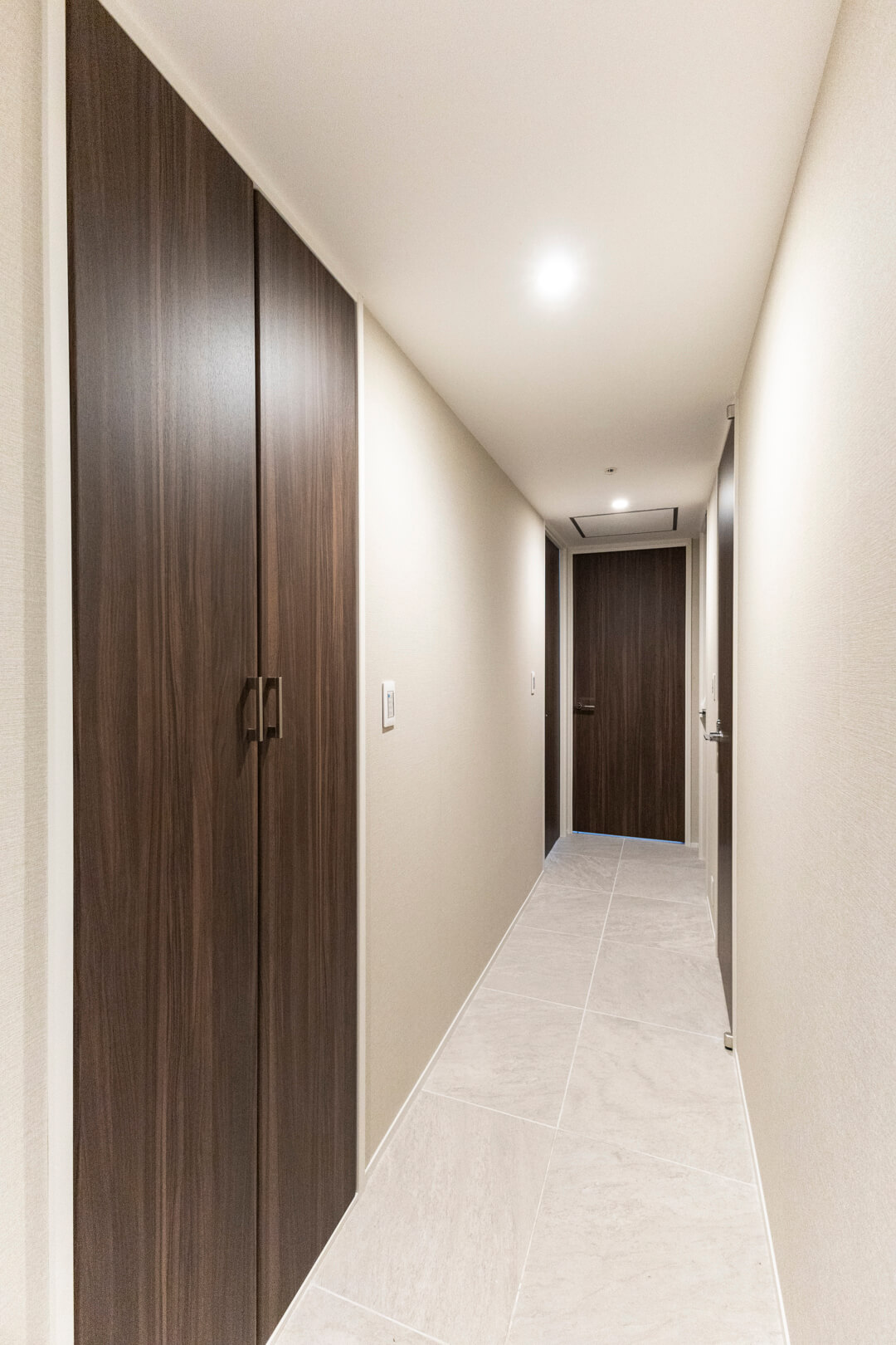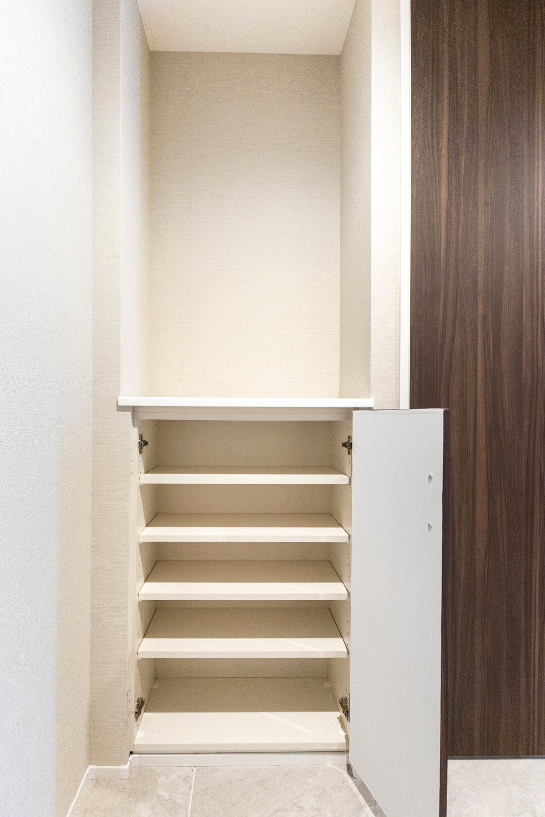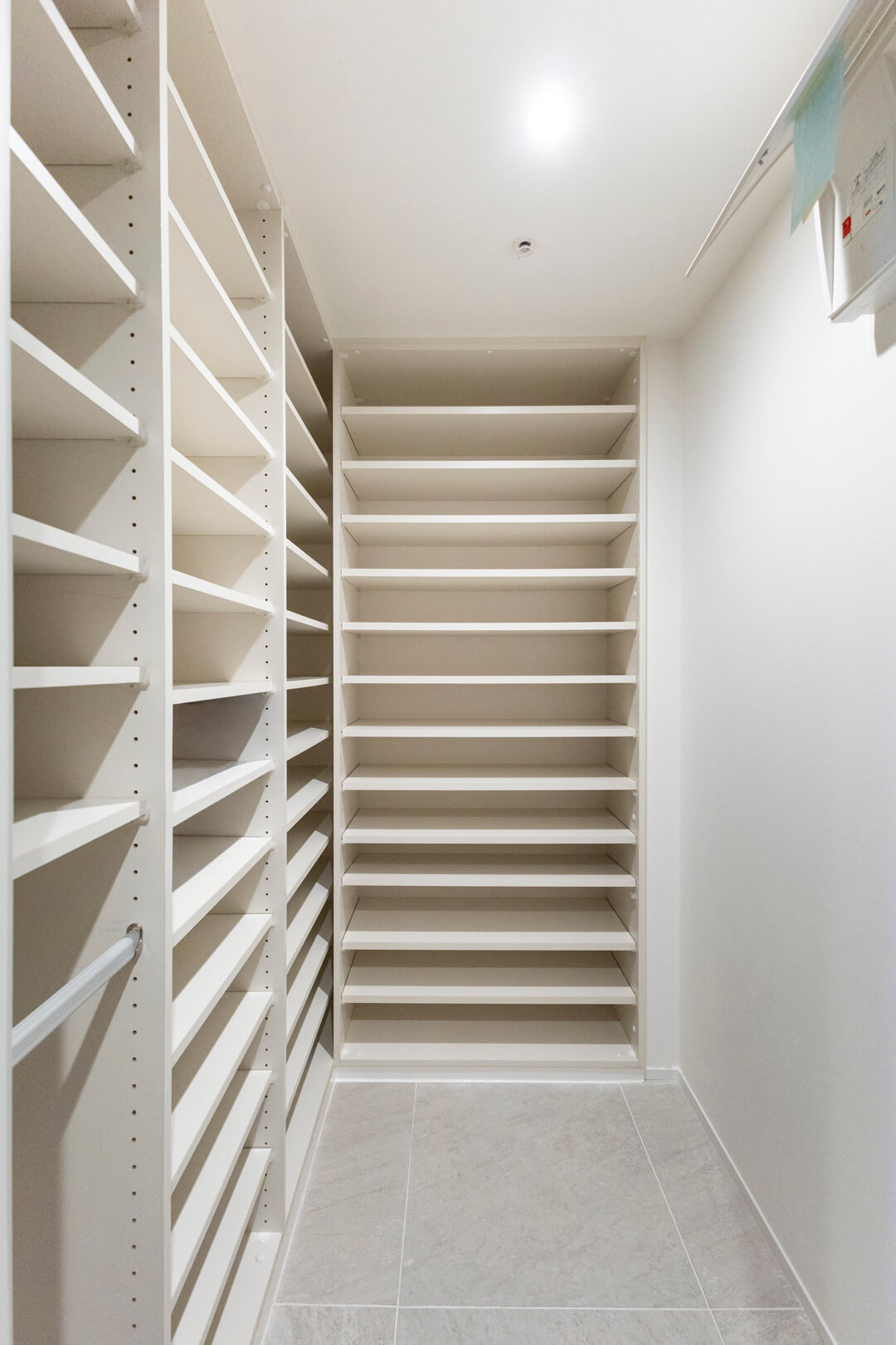 収納性の高い玄関・廊下。入って右手にはSIC(シューズインクローゼット)を完備しています。靴はもちろん、ベビーカーや雨具も収納でき、すっきりとした玄関スペースをキープできそうです。対面側にはコンパクトなシューズボックスがあるので、使用頻度の高い靴はこちらに収納すると良いですね。廊下にも収納スペースがあり、季節家電やトランクケースの収納に重宝しそうです。
