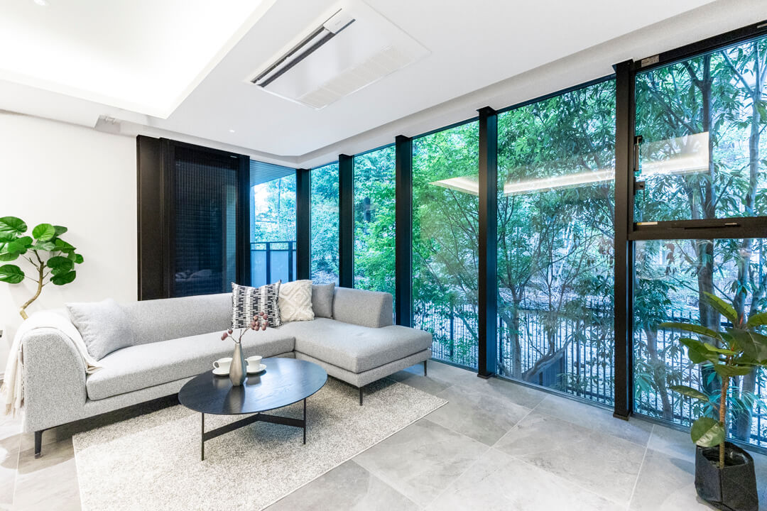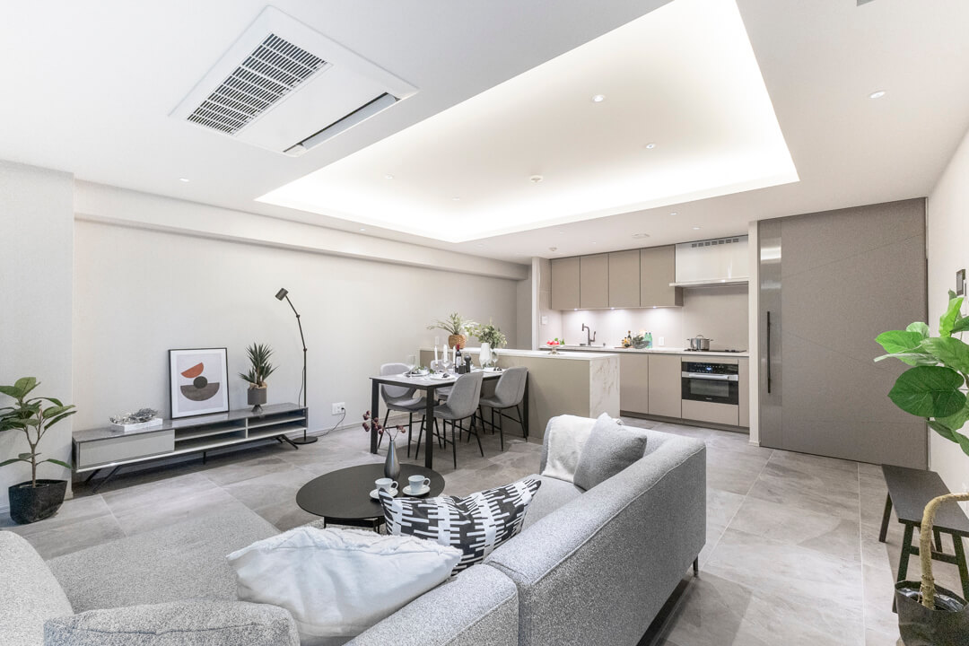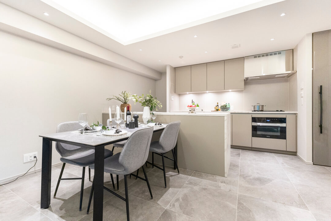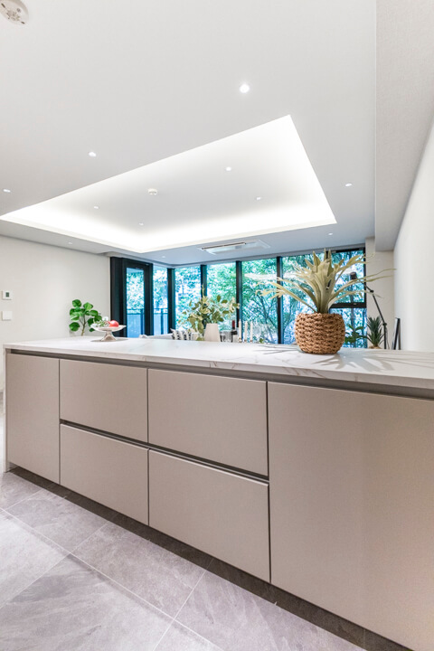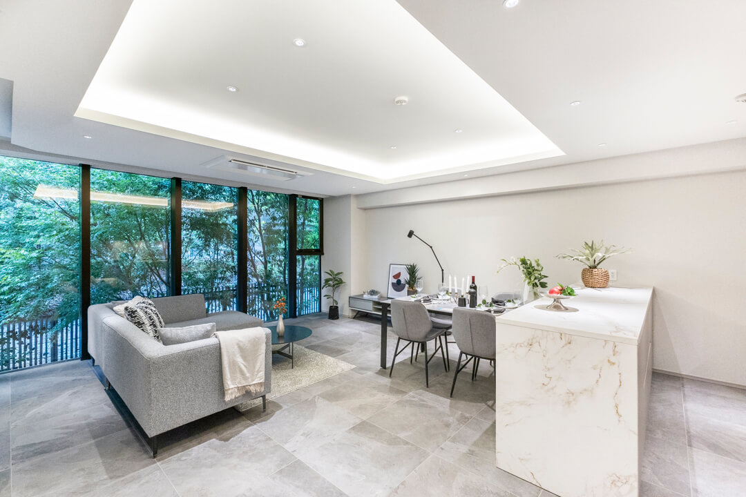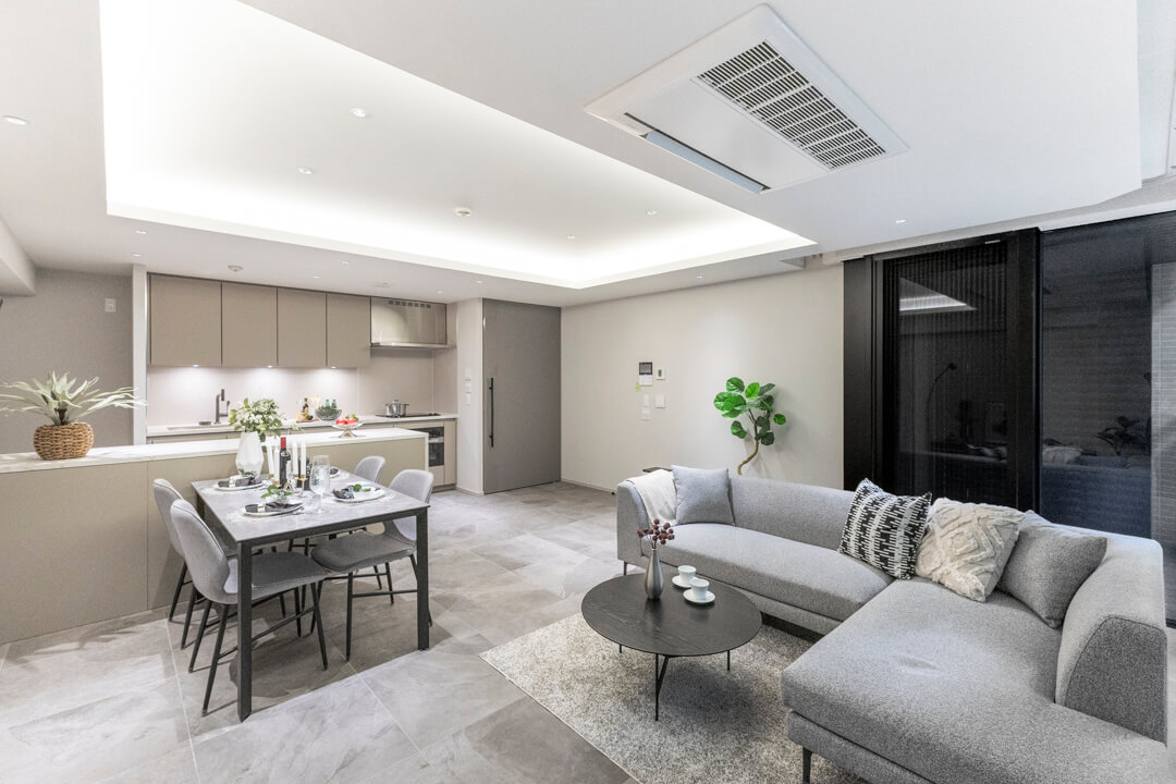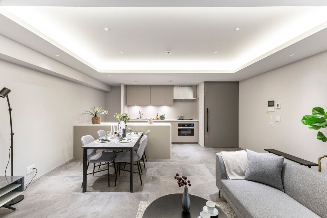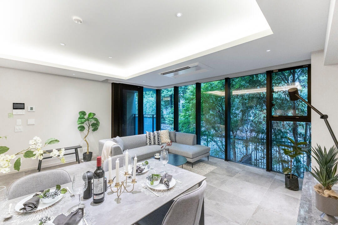 磁器タイル貼りのフロアや間接照明が洗練された印象をもたらすリビングダイニング。キッチンスペースを含めて約19.9帖の広々とした空間です。北西側にはハイサッシが並び、開放感たっぷり。窓から木々の緑が見えるのも嬉しいですね。スタイリッシュなビルトインエアコンにも、空間を広く見せる効果が期待できますよ。