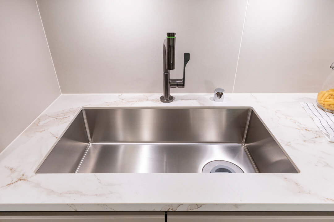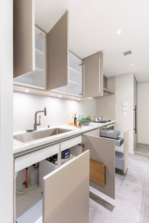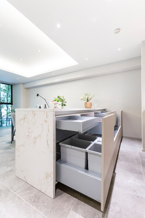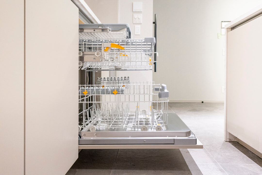 容量の大きさで人気のMiele(ミーレ)製食洗機を内蔵。さらに、シンクにはディスポーザーが付いています。生ごみ処理の手間が軽減され、悪臭の原因を防いでくれますよ。後片付けも捗りそうですね。