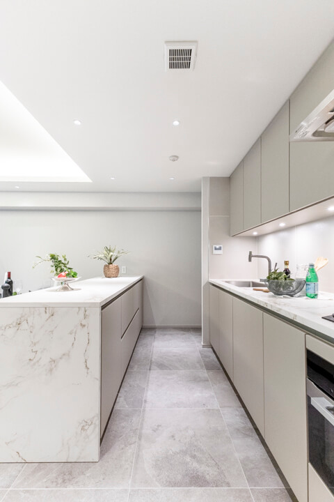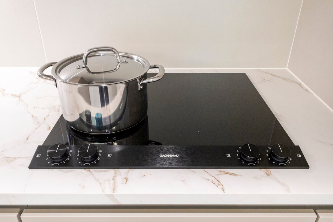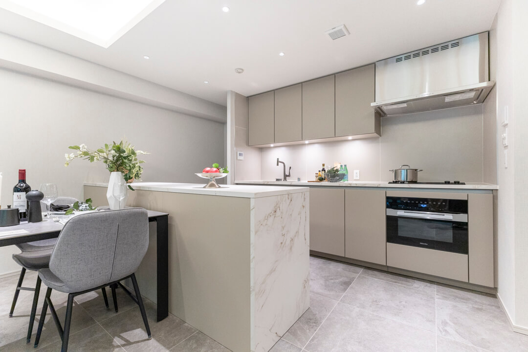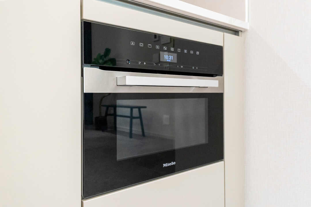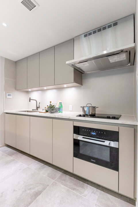グレートーンでスタイリッシュなキッチン。調理に集中しやすい壁付けタイプです。GAGGENAU(ガゲナウ)製の4口IHクッキングヒーター、Miele(ミーレ)製電子レンジ機能付オーブンが内蔵されていて、調理効率UP。料理のレパートリーも増えそうです。
