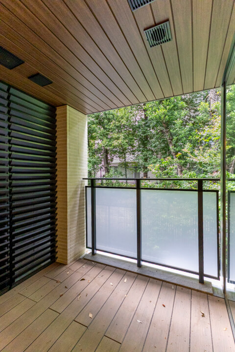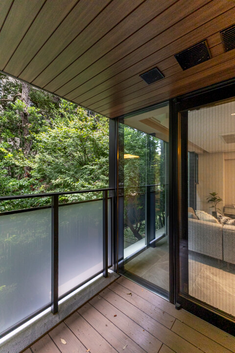 リビングダイニングと寝室に接続するバルコニー。ウッドデッキが敷かれていて、室内外の繋がり感を感じることができ、各スペースがより広々と、開放的な雰囲気になります。気軽に出入りしやすいのも良いですね。低層階ですが、植栽の緑が目隠しの役割を果たしてくれます。