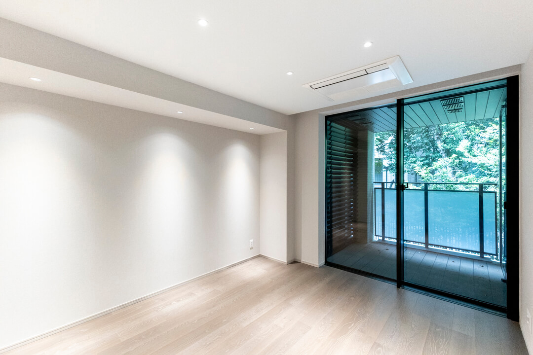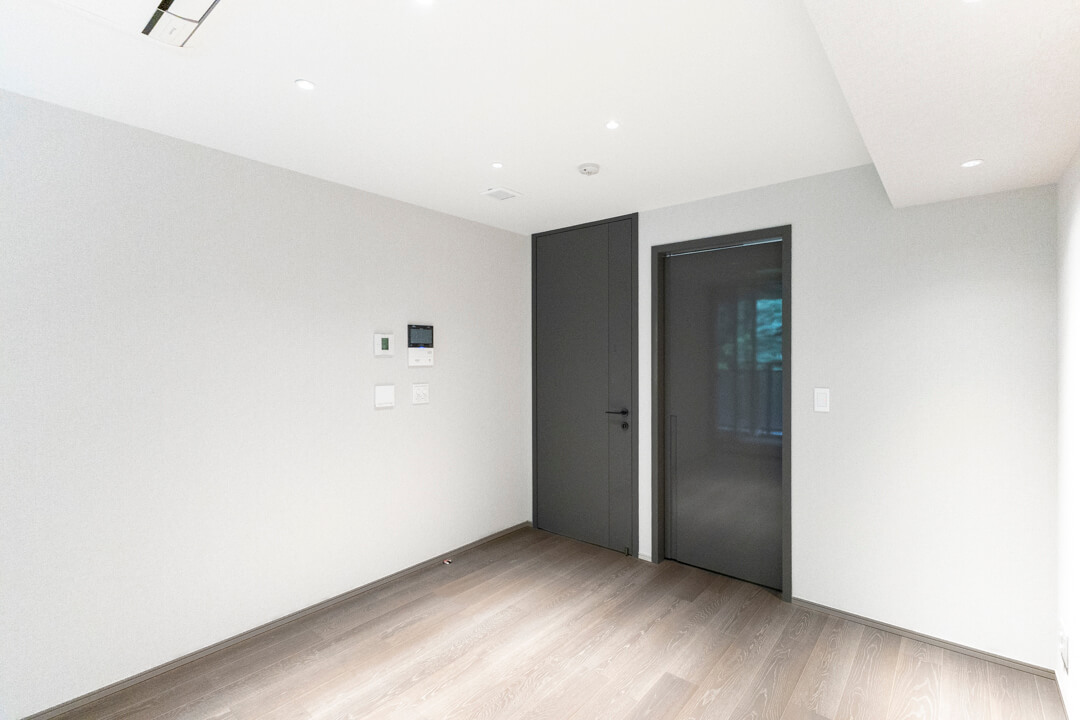 約7.0帖の寝室。バルコニーに面するハイサッシ付きで開放的な空間です。リビング同様、ビルトインエアコン&床暖房が設置されていて、1年中快適に過ごすことができますよ。インターホン付きで、急な来客時にリビングまで行く手間がかからないのも嬉しいですね。