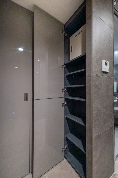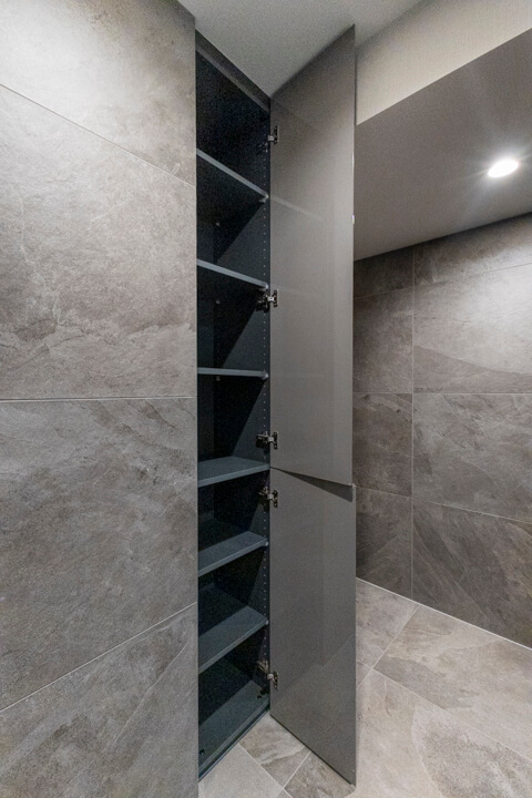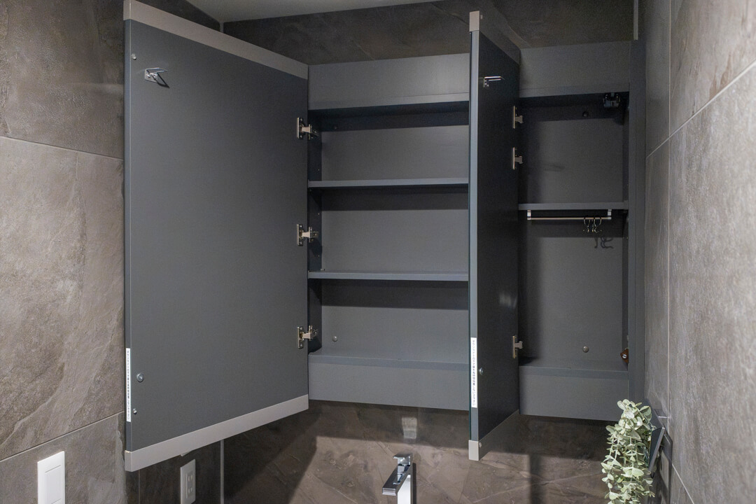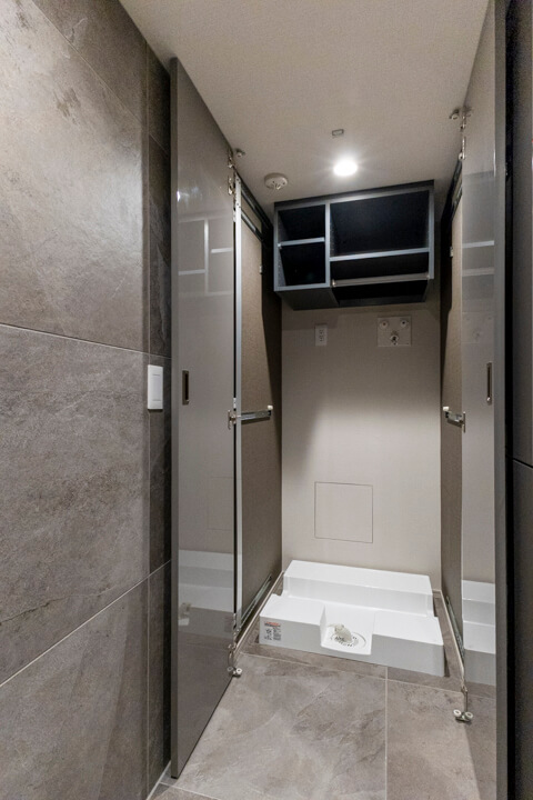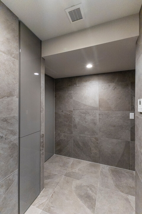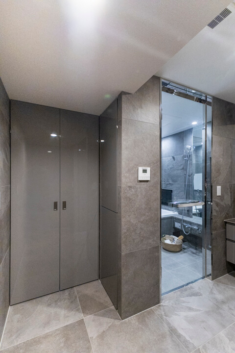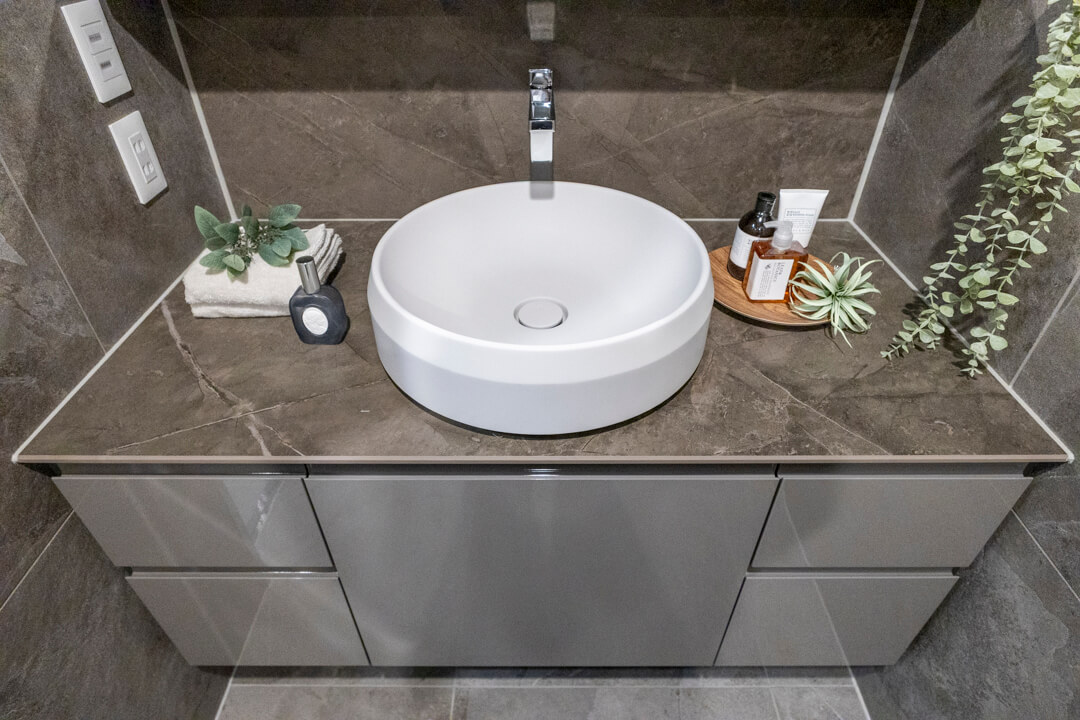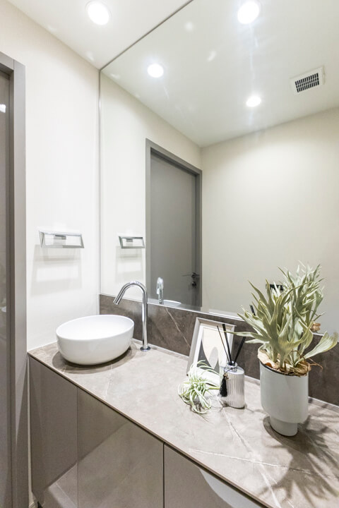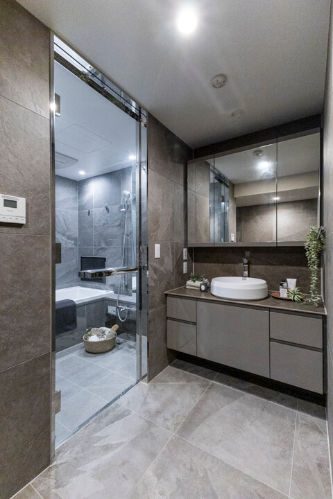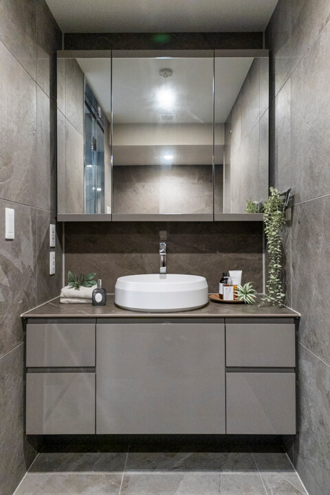 磁器タイル貼りで高級感の漂う洗面室。大きな三面鏡付きの洗面化粧台が設置されています。置き型の洗面ボウルがホテルライクな雰囲気を演出。カウンタースペースにゆとりがあるので、化粧品やドライヤーの仮置きができて便利です。洗面台本体の収納に加え、リネン庫もあり、豊富な収納も魅力的ですね。洗濯機置き場は扉付きなので、生活感が出る部分を目隠しできるのが嬉しいポイントです。