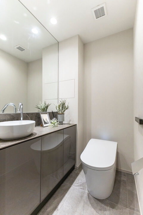 廊下に面していて独立性の高いレストルーム。TOTO製の洗浄機能付トイレを採用しています。タンクレス仕様でスタイリッシュですね。大きな一面鏡付きの手洗いカウンターが設置されていて、ホテルライクな雰囲気。すぐに手を洗うことができ、ゲストを洗面室まで案内する手間もかかりません。