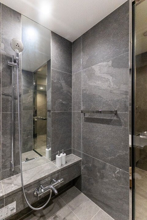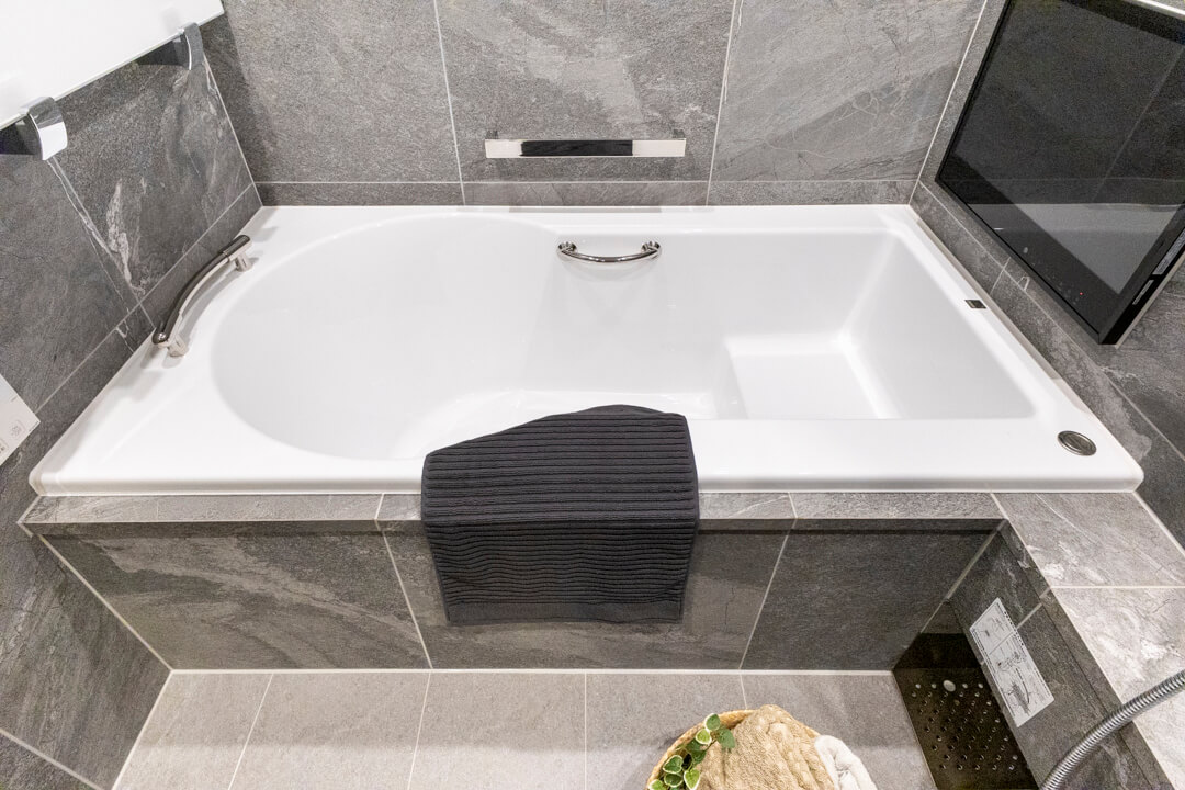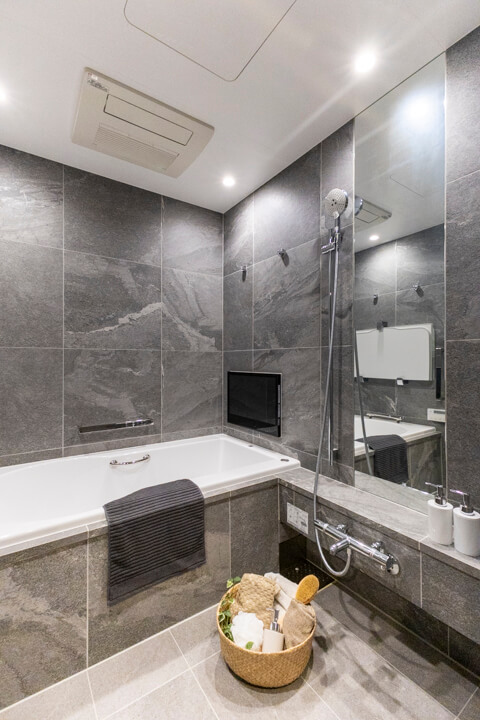 ゆったり過ごせる1620サイズのバスルーム。石目調デザインでラグジュアリーな空間です。浴室換気乾燥暖房機・追い焚き機能搭載で、1年中快適なバスタイムに。浴室TVも設置されていて、ゆっくり半身浴を楽しむことができます。
