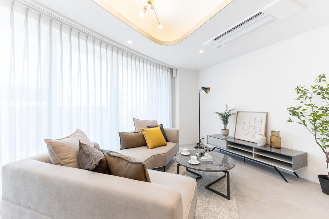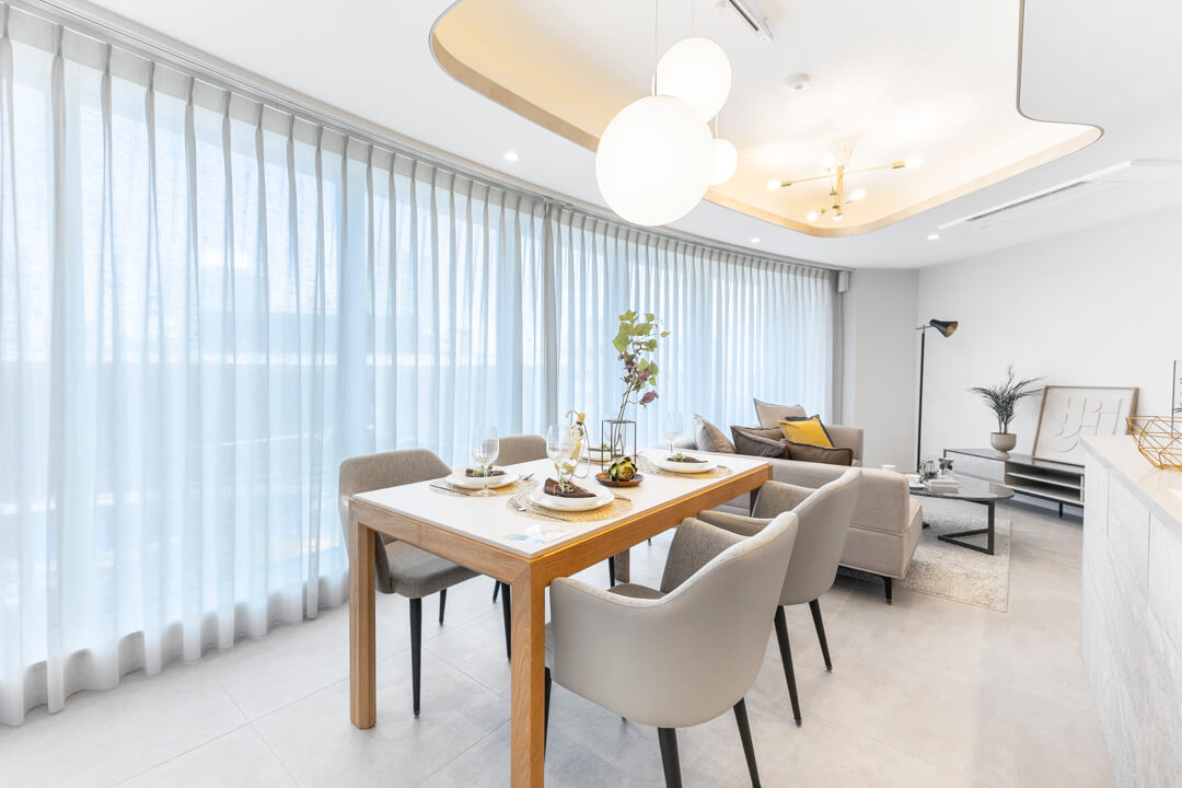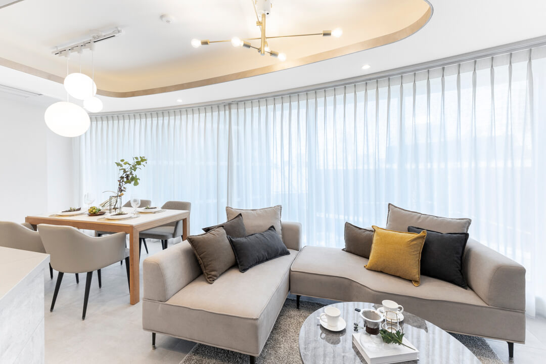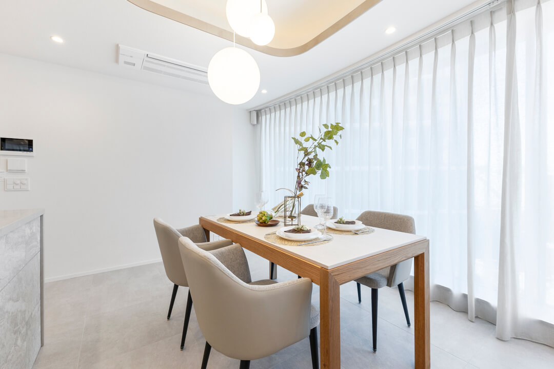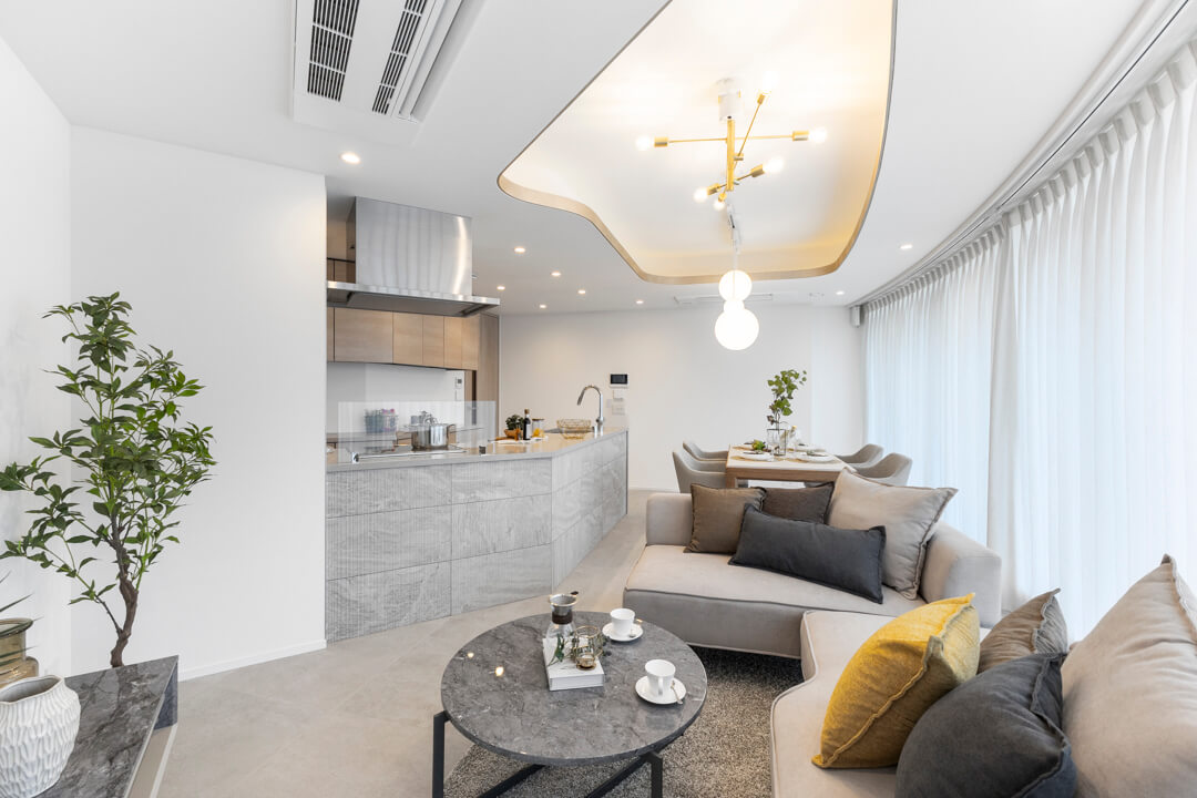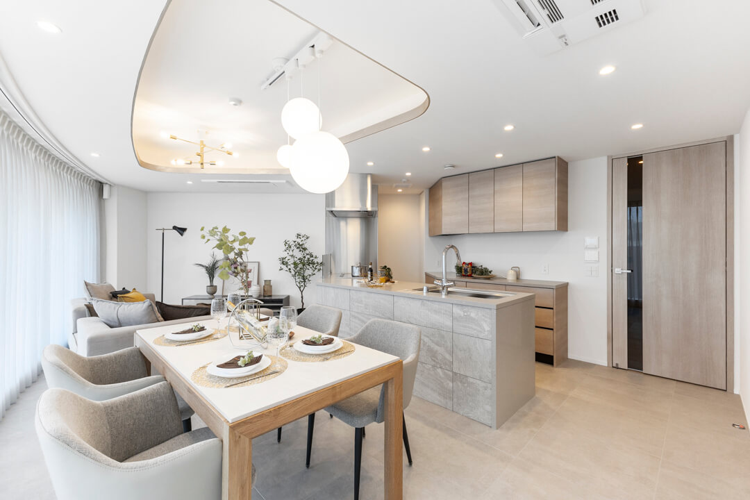 約19.0帖の広々としたLDK。大開口の窓が並び、開放感溢れる空間です。カーブを描いた間取りがやわらかな印象をもたらします。お部屋の形に沿った折り上げ天井も特徴的。間接照明が施され、心地よい明かりがリラックスタイムへ誘ってくれそうです。エアコンにはすっきりとした見た目のビルトインタイプを採用していて、空間に奥行きをもたらします。