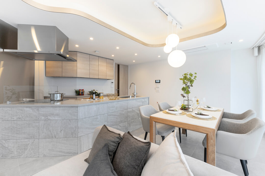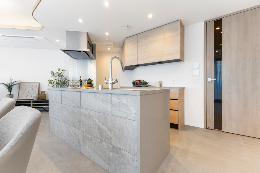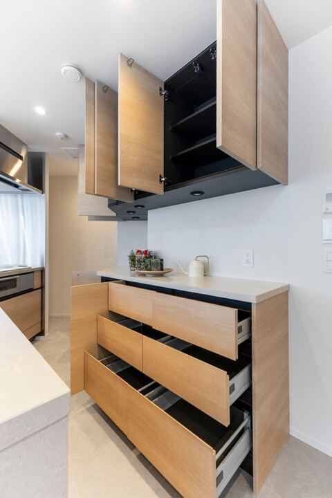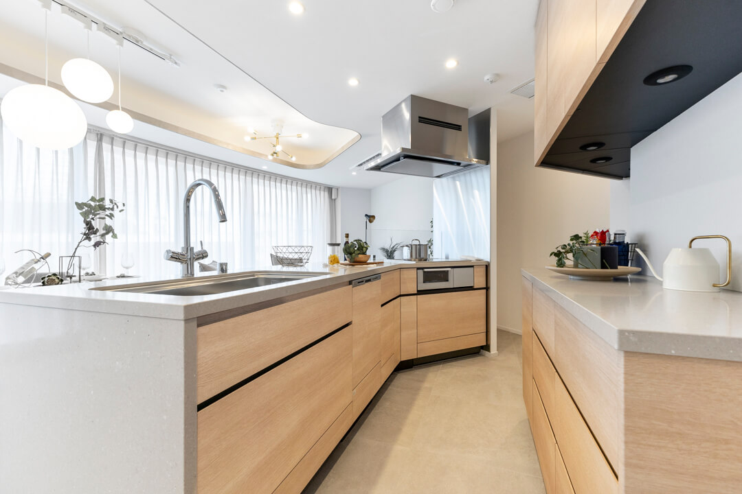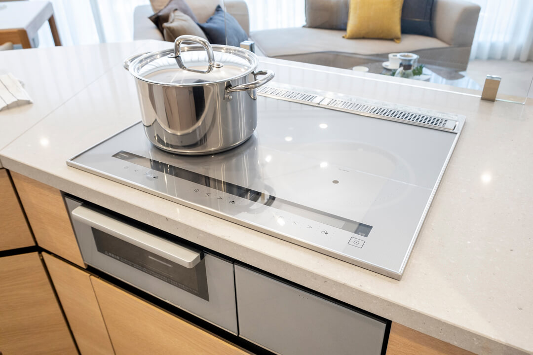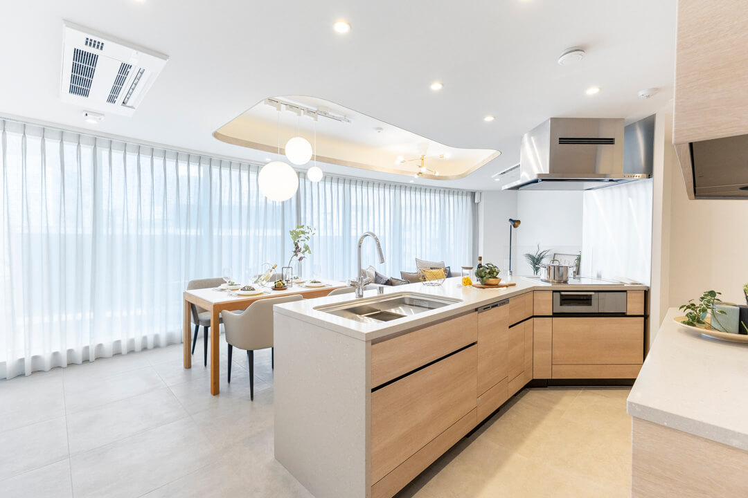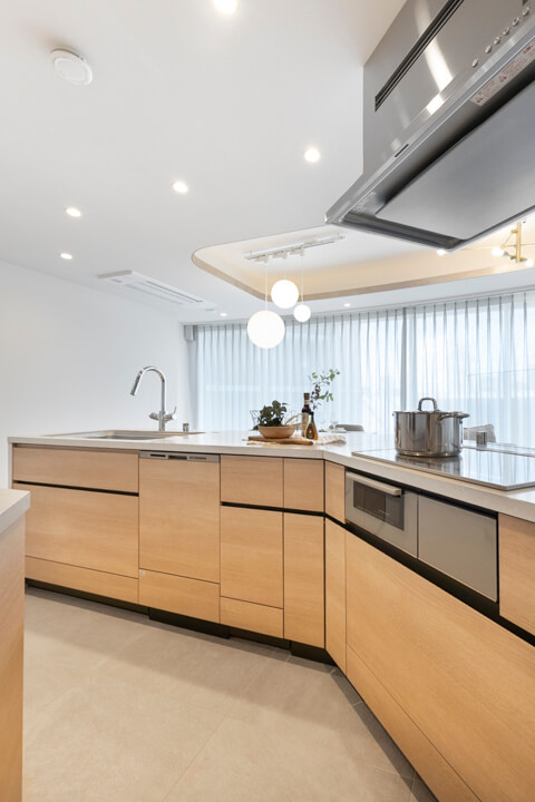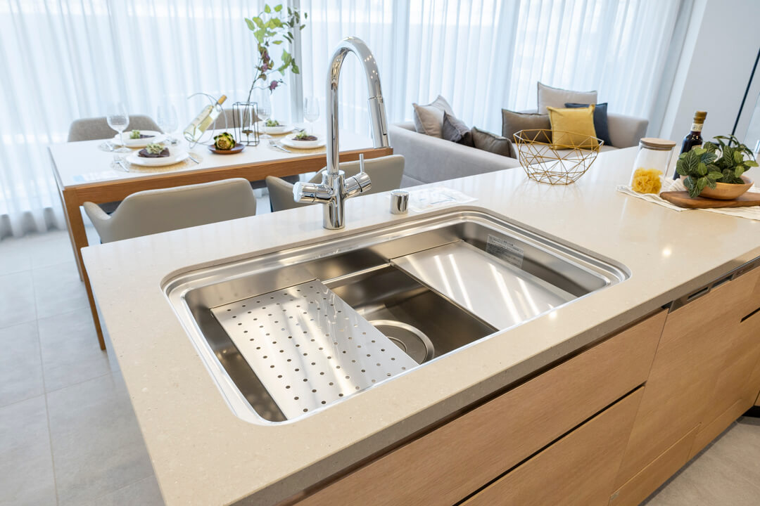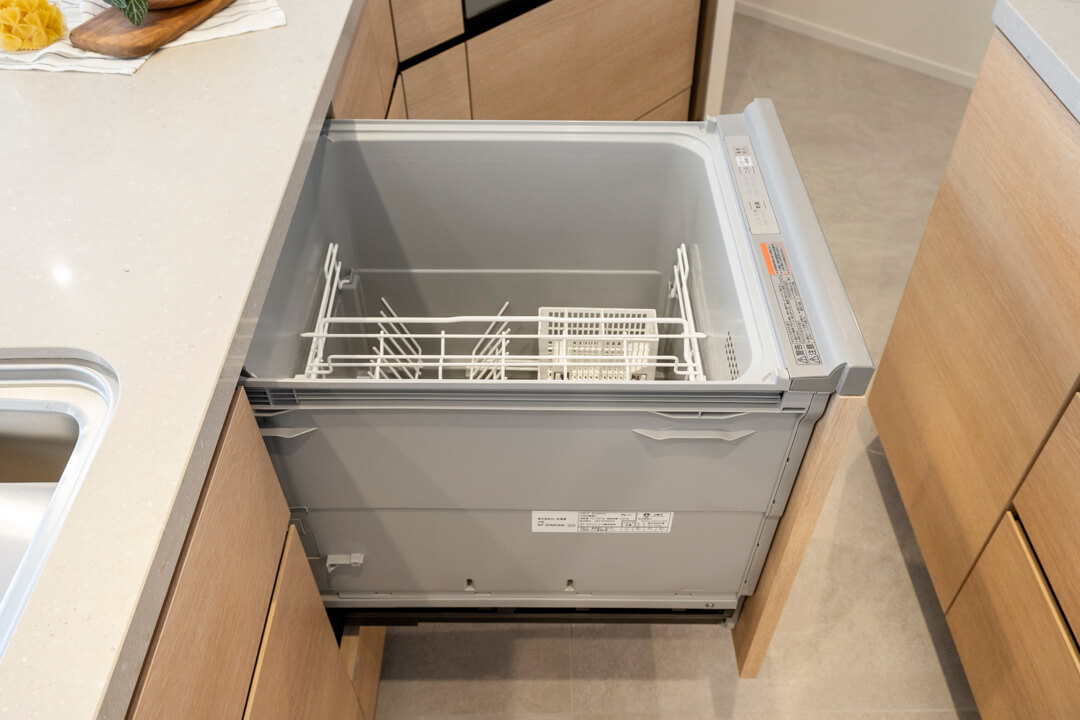 スイッチで火力を調節でき、ガスコンロよりも調整が簡単なIHクッキングヒーターを採用。凹凸がなくフラットなので掃除がしやすいのも魅力的です。さらに、後片付けの時短が叶う食洗機、ディスポーザーも搭載されています。料理後すぐに生ゴミを処理できるので、掃除の手間が軽減され、悪臭の原因を防いでくれますよ。