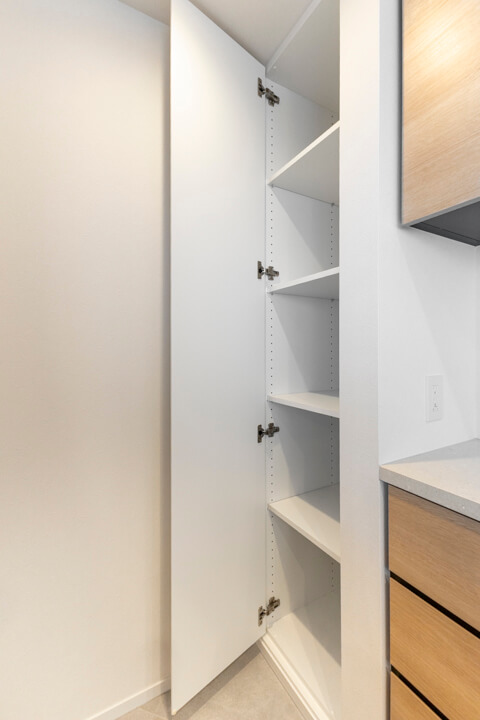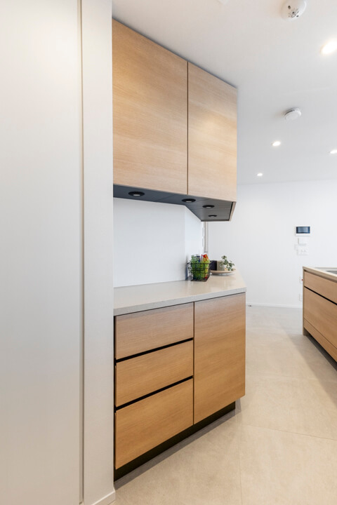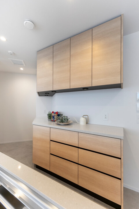 背面には収納力のあるカップボードを完備。キッチンと同じデザインで統一感があります。可動棚も設置されていて、ごちゃごちゃしがちなキッチンまわりがすっきり片付きそうです。カウンターにはコンセントが付いているので、キッチン家電の使用にも便利ですよ。