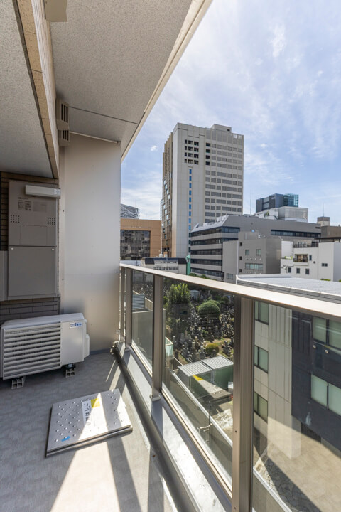 寝室1に面するバルコニー。南西向きにつき晴れの日にはあたたかい光がたっぷり降り注ぎます。南側には墓地が見えたので、気になる方はご注意ください。