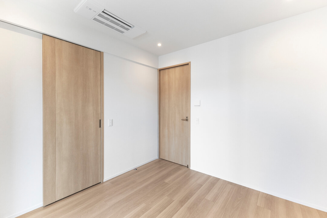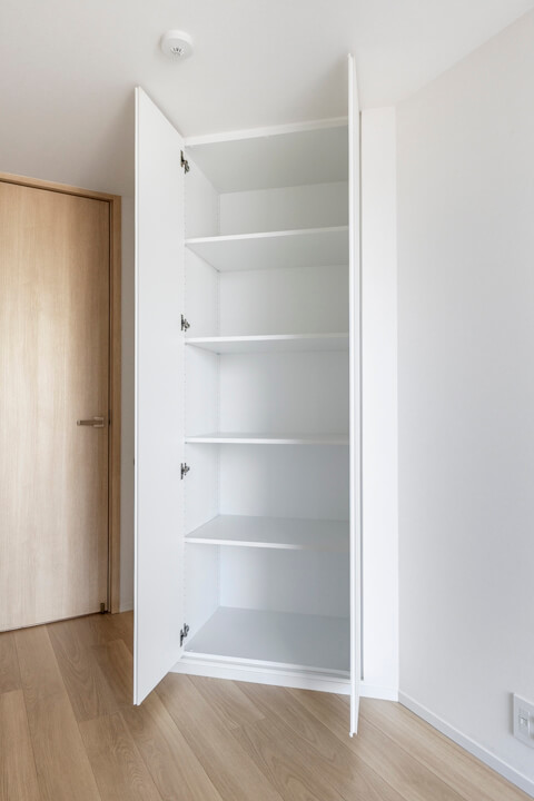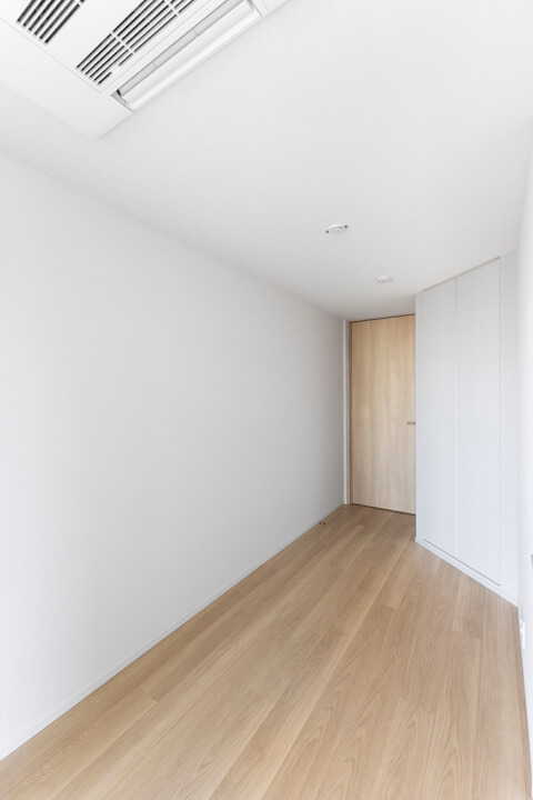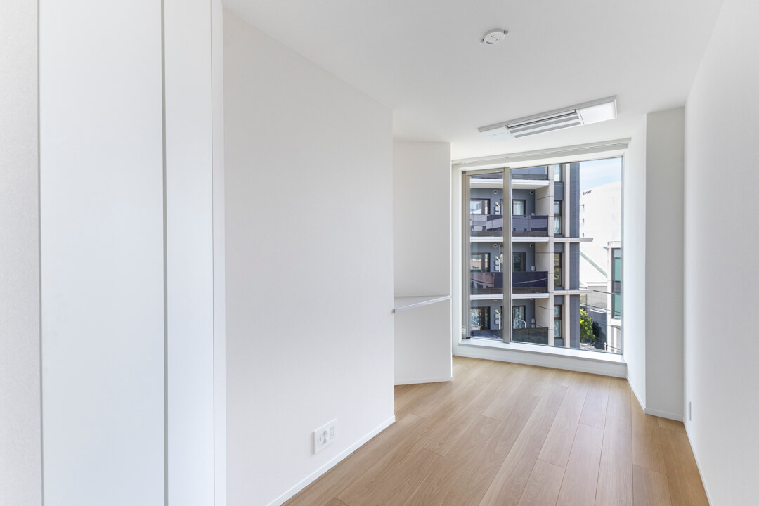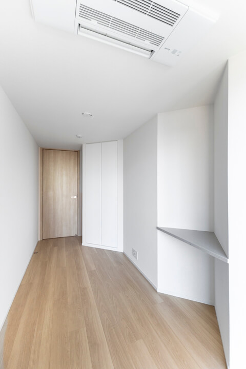 約5.0帖の寝室2は縦長の間取りが印象的。大きな窓やビルトインエアコンが奥行きをもたらします。可動棚収納&デッドスペースを活かしたカウンターを設置。ほど良いこもり感のある空間なので、ワークスペースや趣味部屋におすすめです。
