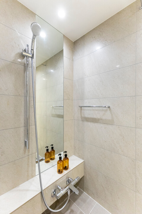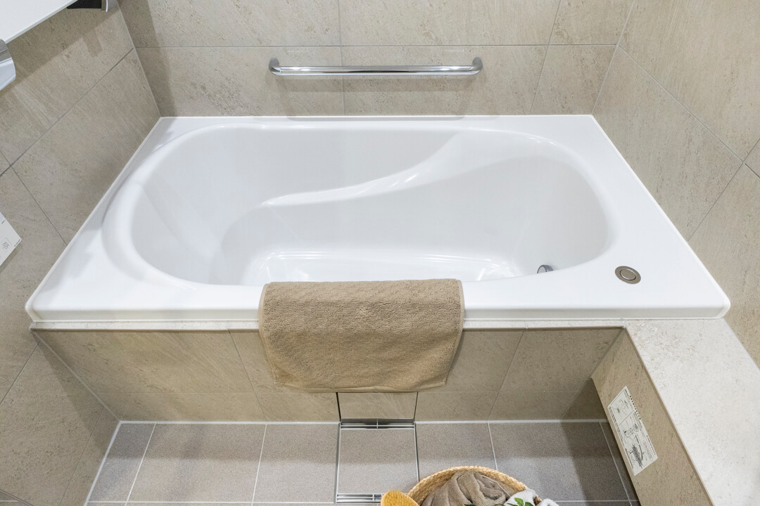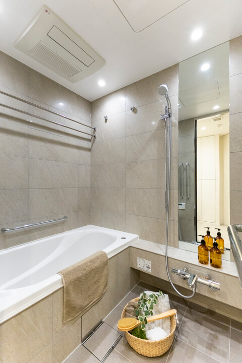 石調デザインで上質な雰囲気が漂うバスルーム。1418サイズです。浴室換気乾燥暖房機・追い焚き機能搭載で1年中快適なバスタイムを過ごせます。丸みを帯びた浴槽が疲れた身体を包み込んでくれそうですね。ランドリーパイプも設置されているので、雨の日の洗濯スペースとしても重宝しそうです。